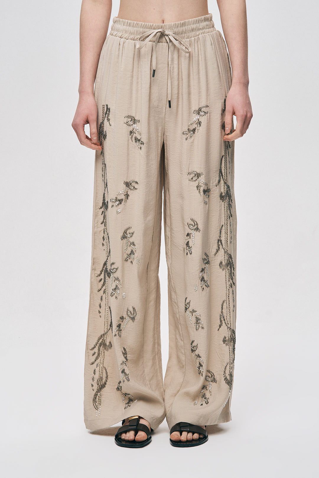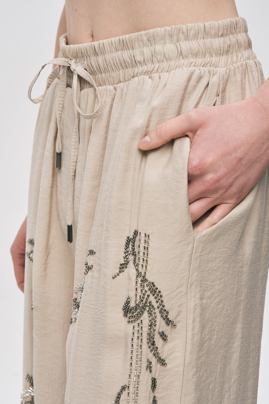 • Işıltılı El İşçiliği: Pantolonun hem ön panelinde hem de yan hatlarında yer alan gümüş tonlu boncuk işlemeleri, silüetinize hareketli ve zengin bir görünüm kazandırır.
