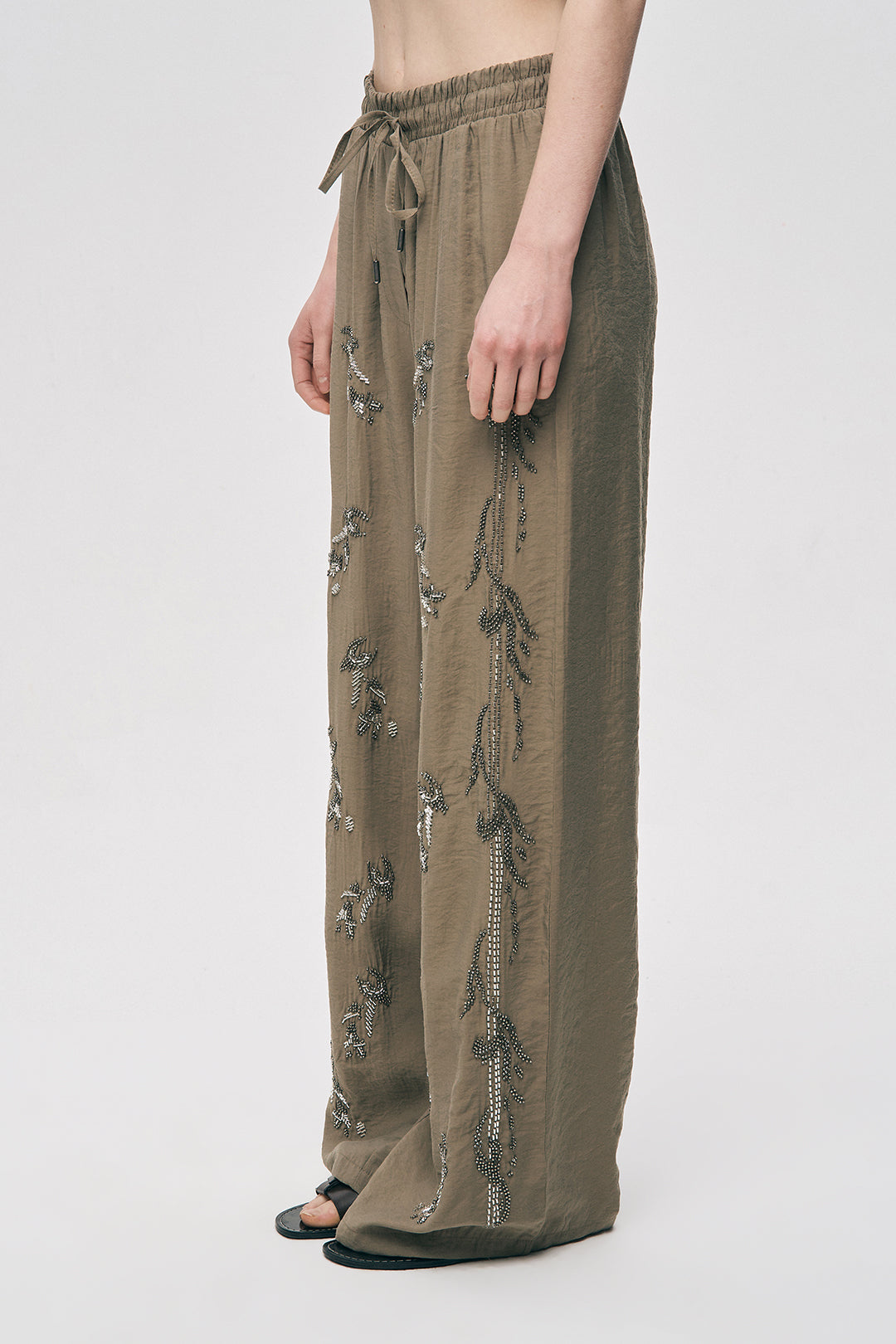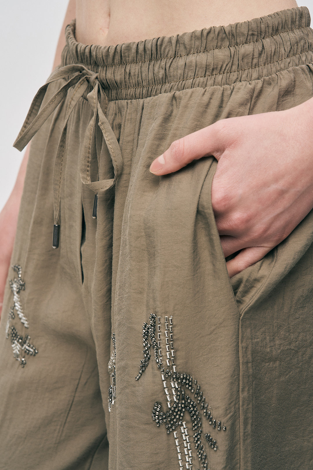 Işıltılı El İşçiliği: Pantolonun hem ön panelinde hem de yan hatlarında yer alan gümüş tonlu boncuk işlemeleri, silüetinize hareketli ve zengin bir görünüm kazandırır.