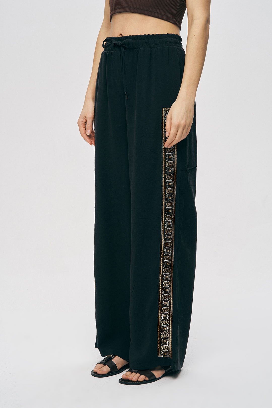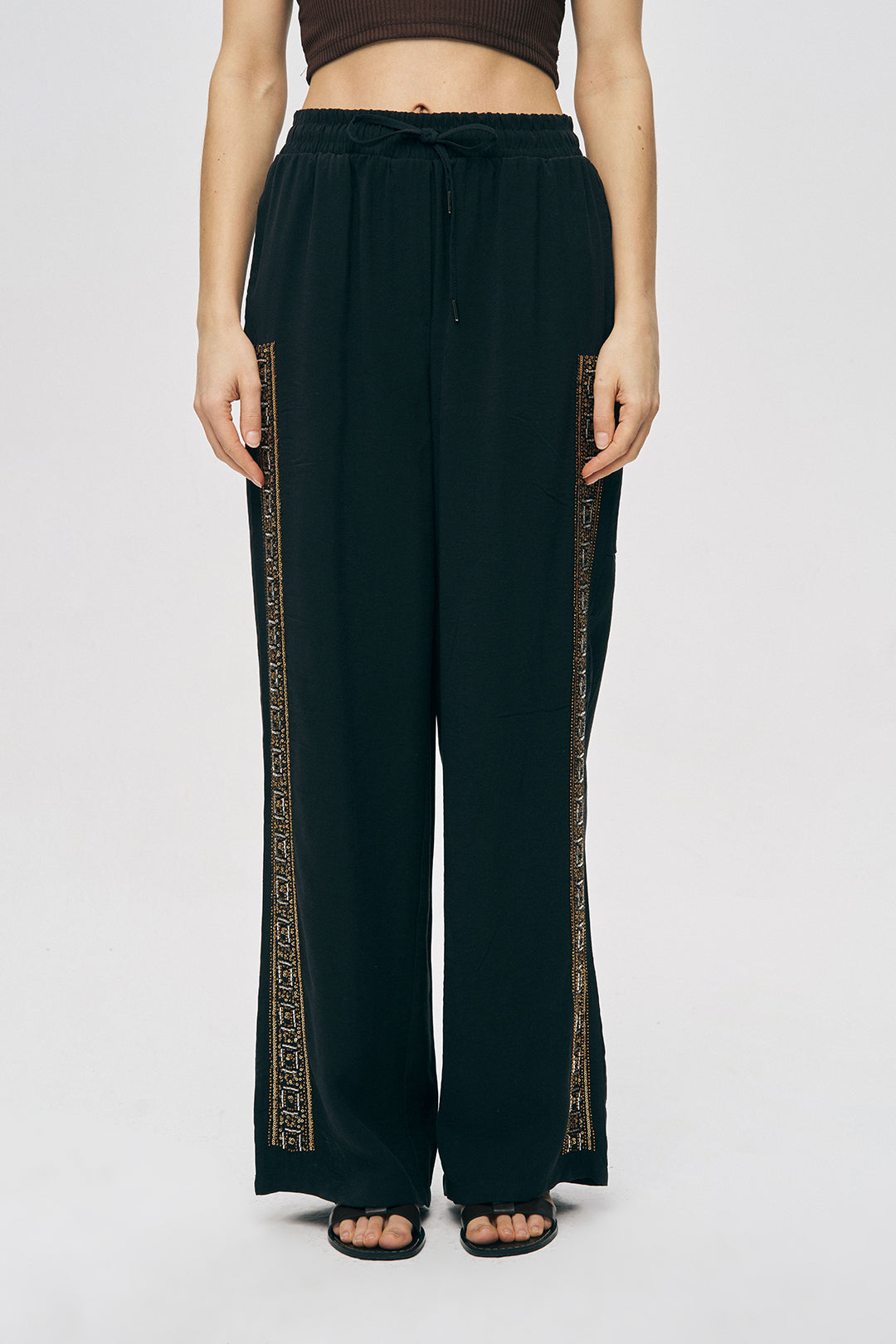 Kadın Zarif Işıltı Yanı Şerit Boncuk İşlemeli Palazzo Pantolon