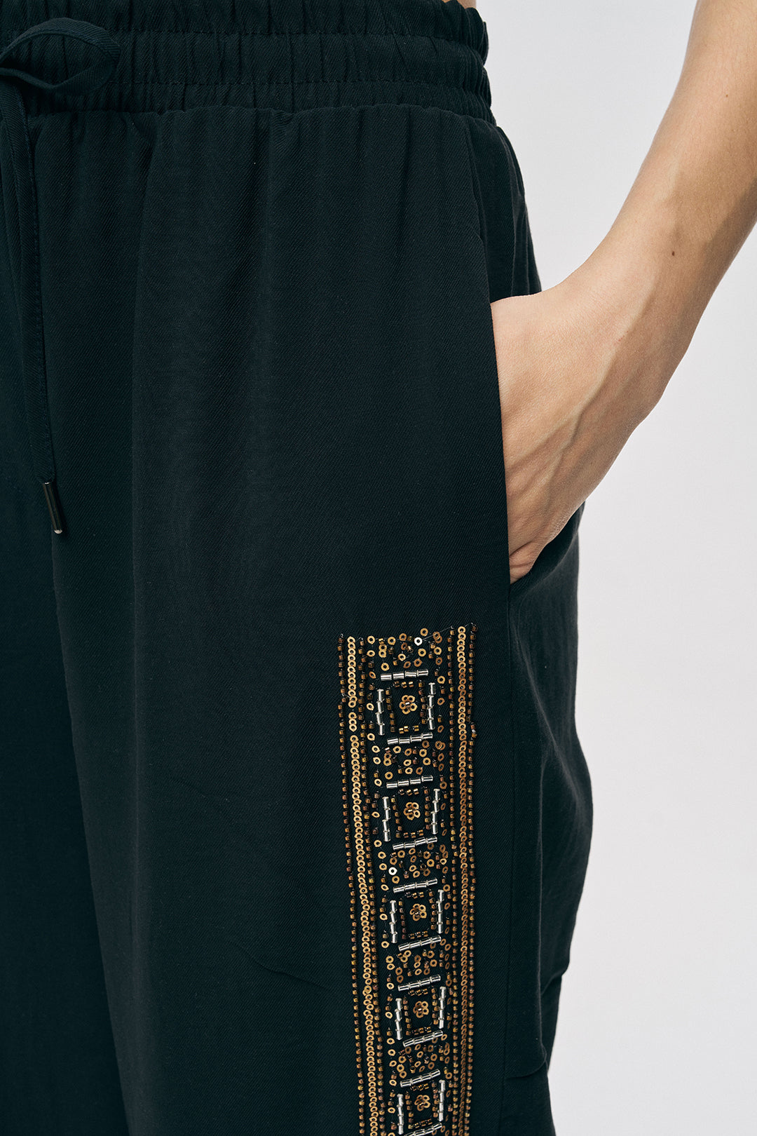 Türkiye’de kendi üretim tesislerimizde "Zarif Işıltı" koleksiyonuna özel olarak tasarlanan bu pantolon; %90 Modal ve %10 Polyester karışımının doğal lifleri sayesinde ipeksi bir yumuşaklığa ve yüksek nefes alma özelliğine sahiptir. Pantolonun yan şeritleri boyunca uzanan el işçiliği boncuk detayları, 2026 yaz modasının "modern bohem" tavrını vurgularken; beli bağcıklı ve dökümlü yapısı en sıcak günlerde bile serin ve özgür hissettirir.