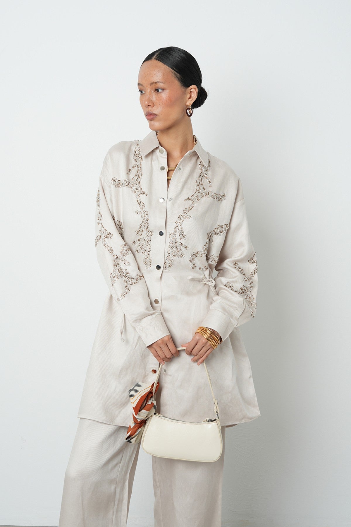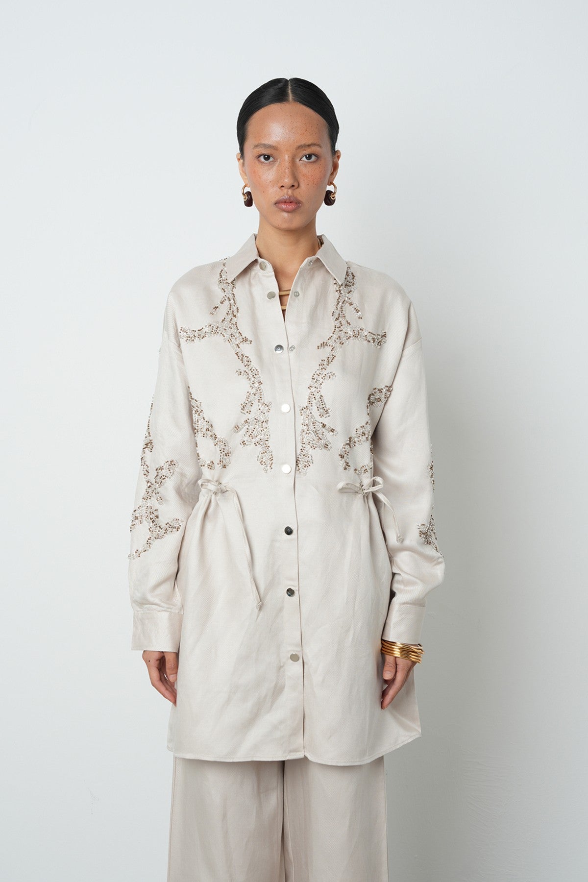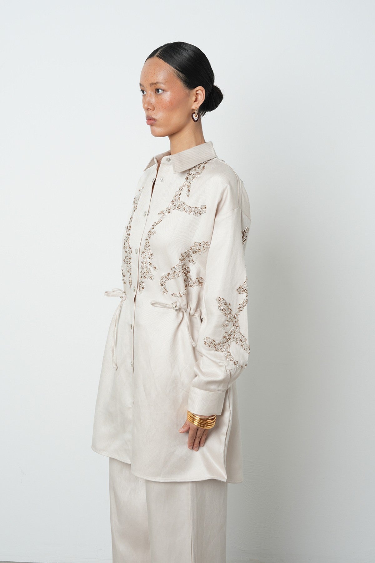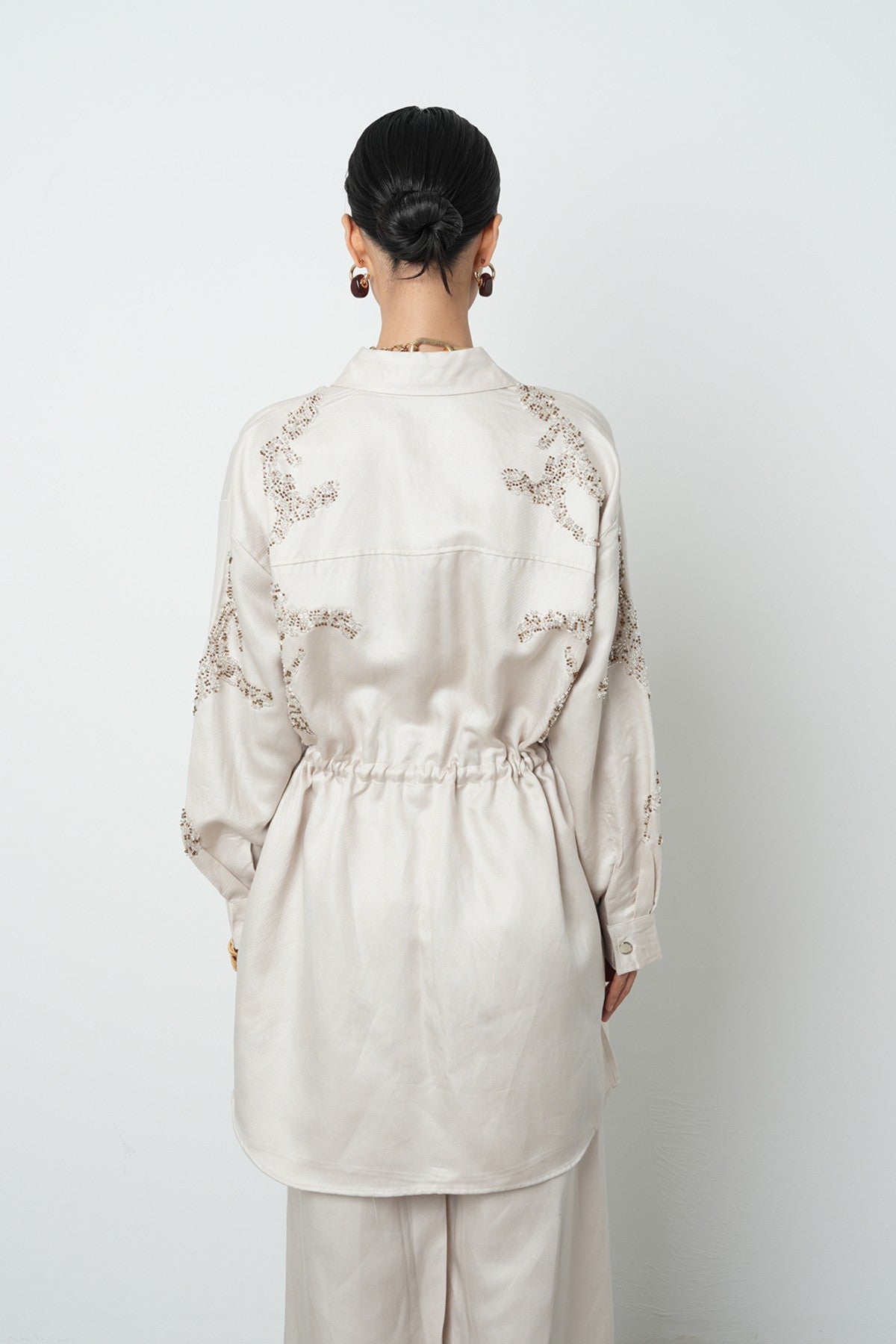 Kadın Boncuk İşlemeli Belden Büzgülü Çıtçıt Kapamalı Ceket