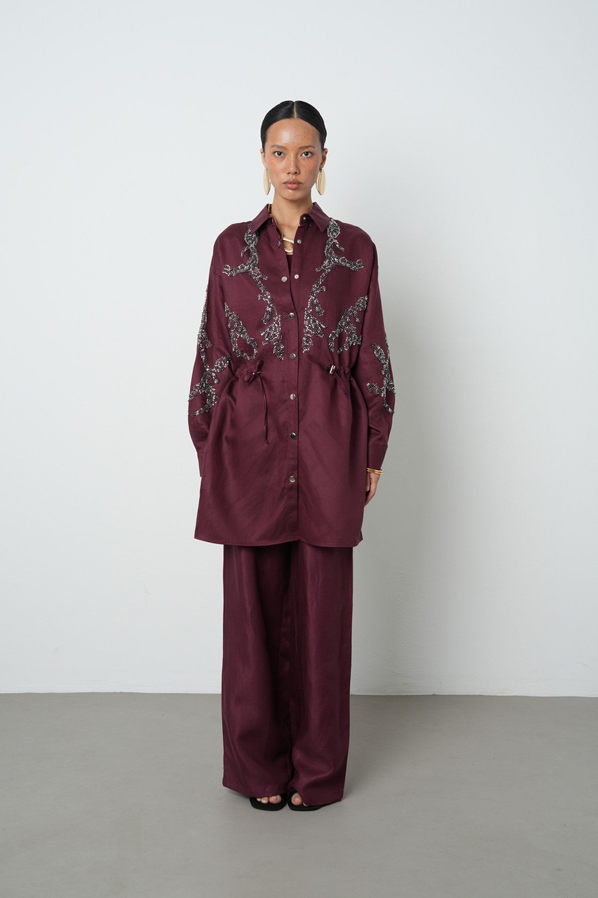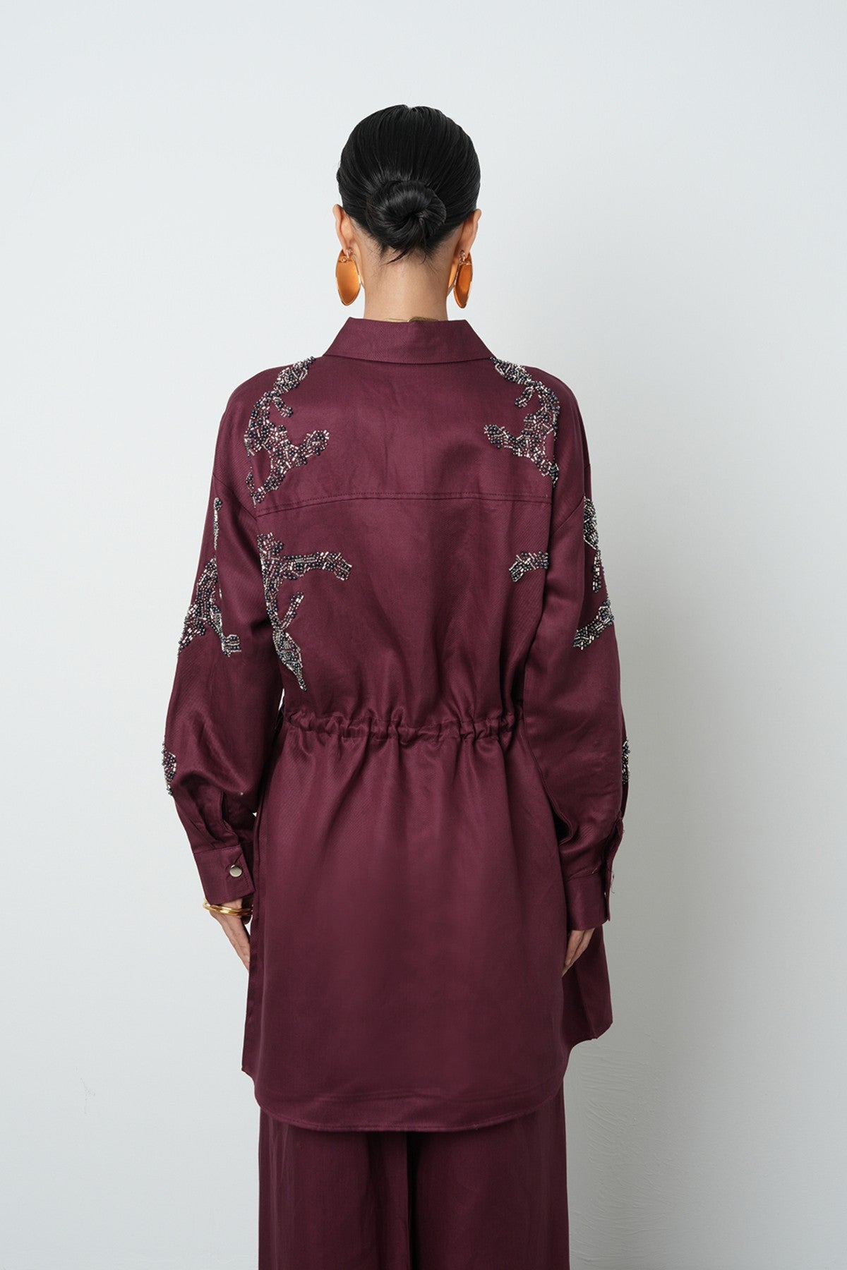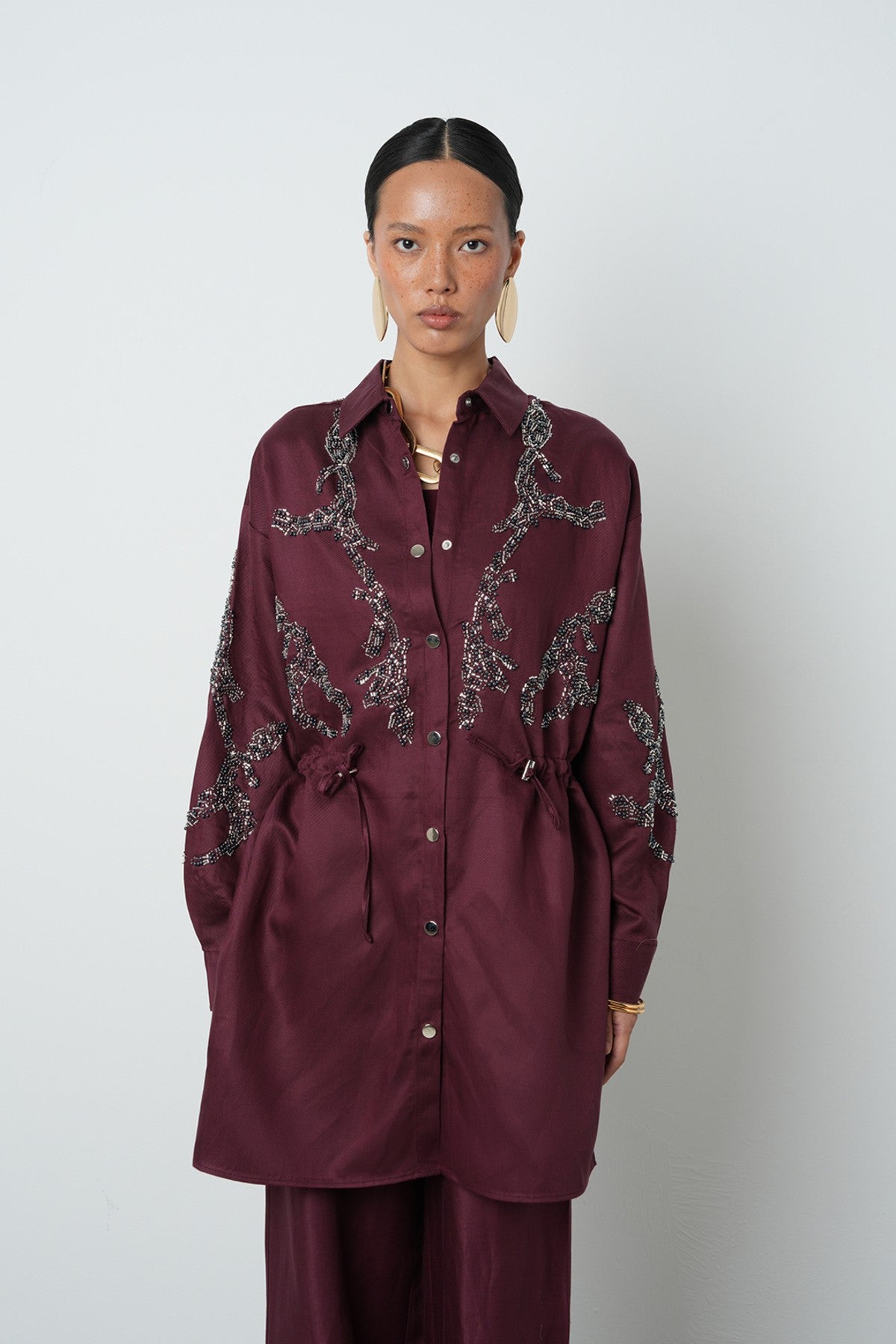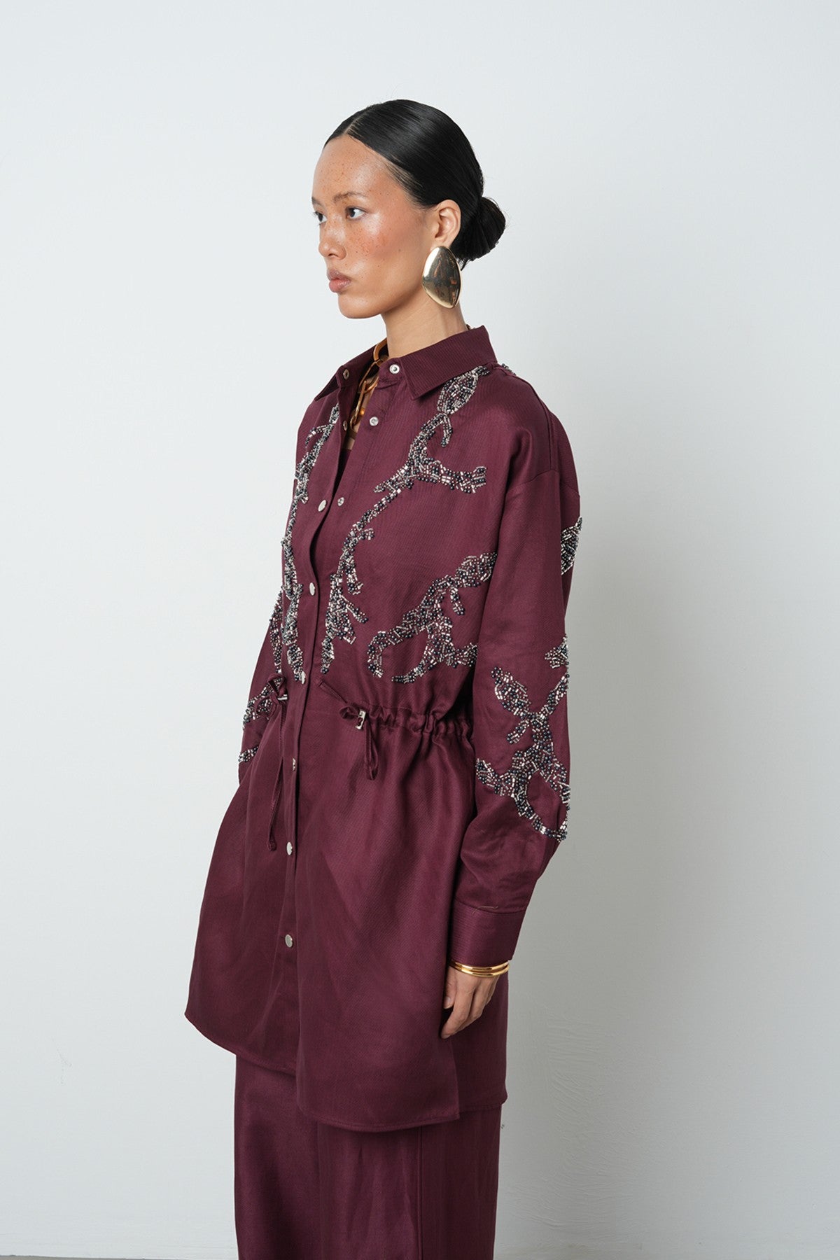 Kadın Boncuk İşlemeli Belden Büzgülü Çıtçıt Kapamalı Ceket