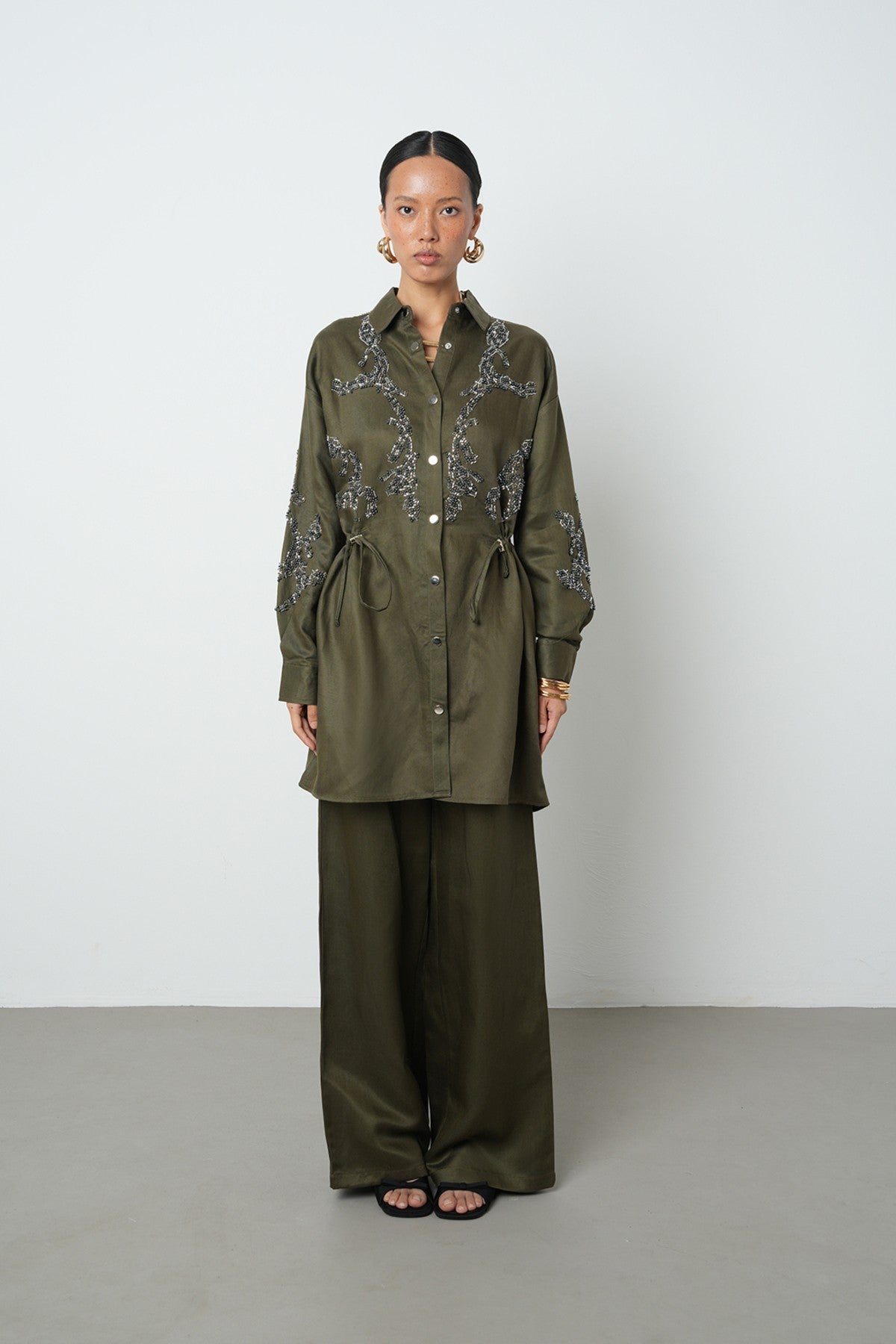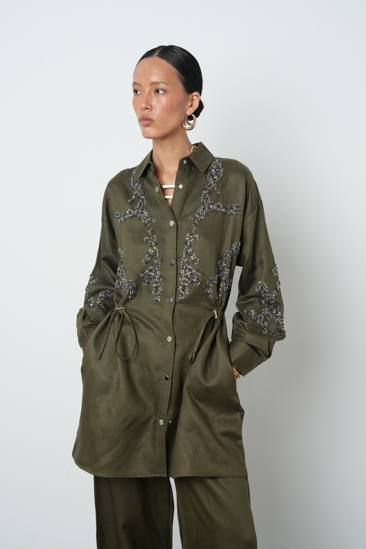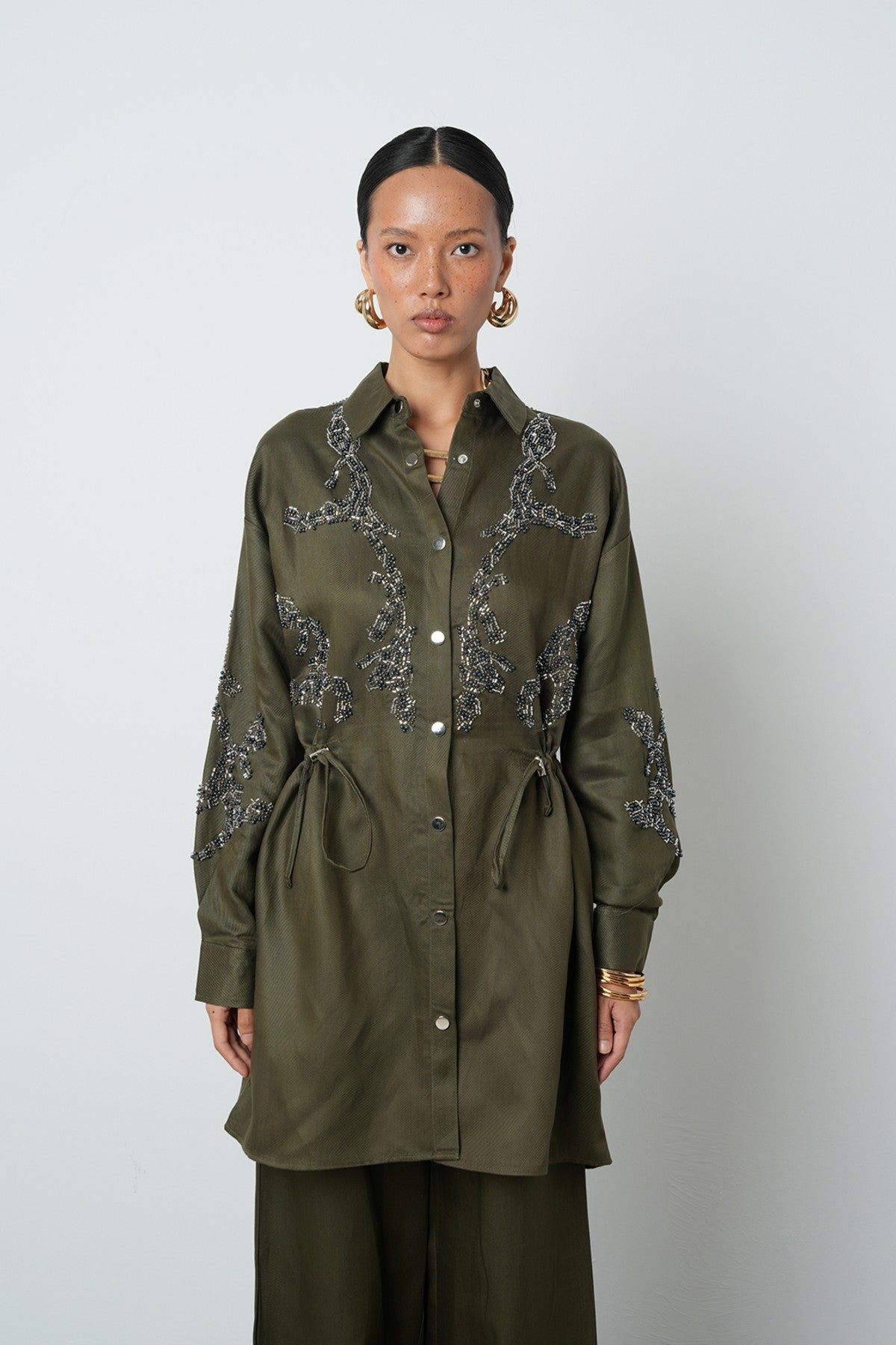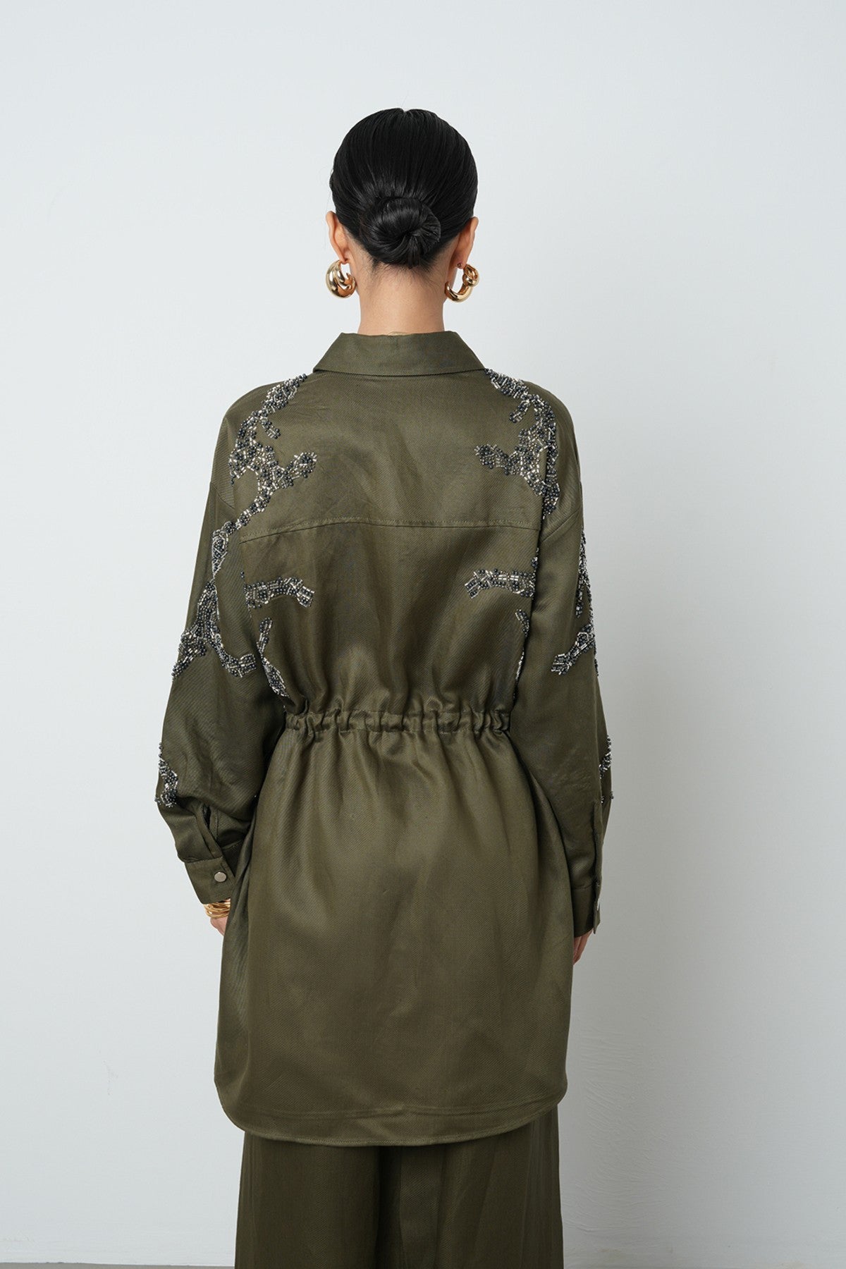 Kadın Boncuk İşlemeli Belden Büzgülü Çıtçıt Kapamalı Ceket