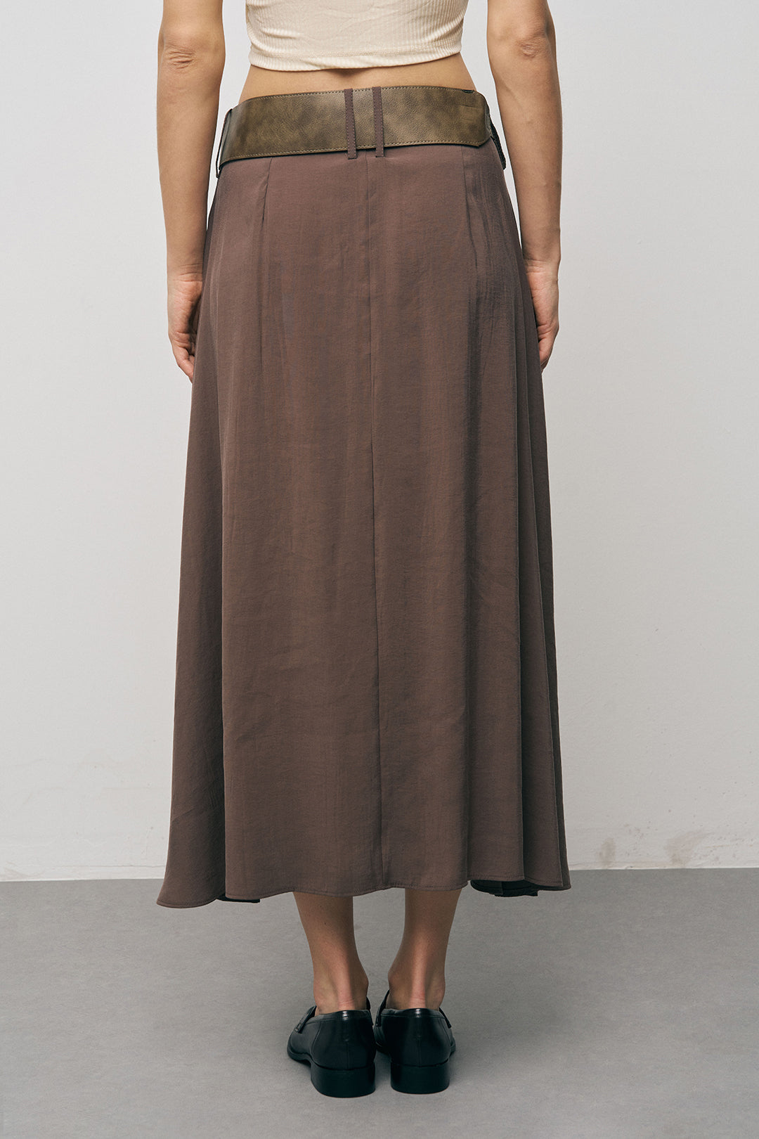 • Manken Bilgisi: 1.77 cm boyundaki manken üzerinde eteğin akışkan formu ve kemer detayları sergilenmektedir.