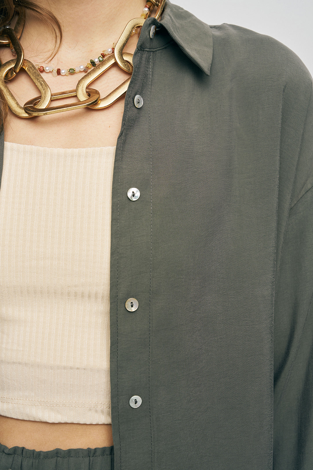 Türkiye’de kendi üretim tesislerimizde yüksek kalite standartlarıyla hazırlanan bu basic gömlek, %85 Modal ve %15 Polyester karışımı sayesinde ipeksi bir yumuşaklığa ve dökümlü bir yapıya sahiptir. Modal kumaşın nefes alan doğal dokusu, gün boyu üst düzey konfor sunarken oversize kesimi modern ve zamansız bir silüet oluşturur. 2026 "rahat şıklık" trendine uygun olarak tasarlanan bu parça, gardırobunuzun en çok yönlü kilit parçalarından biri olacak.