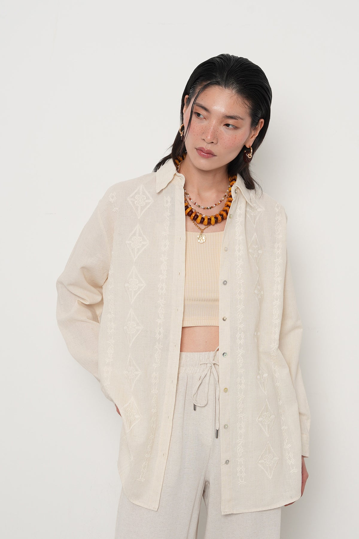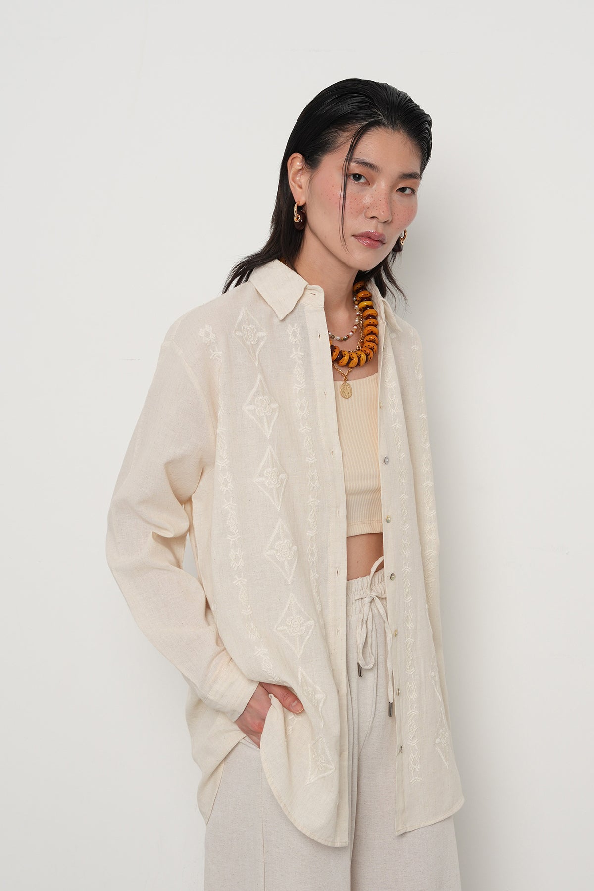 2. Modern Minimalizm: Nakış detaylarını ön plana çıkarmak için alt grupta daha sade, düz renkli keten pantolonlar veya açık renkli denimler tercih ederek dengeli bir görünüm oluşturun.