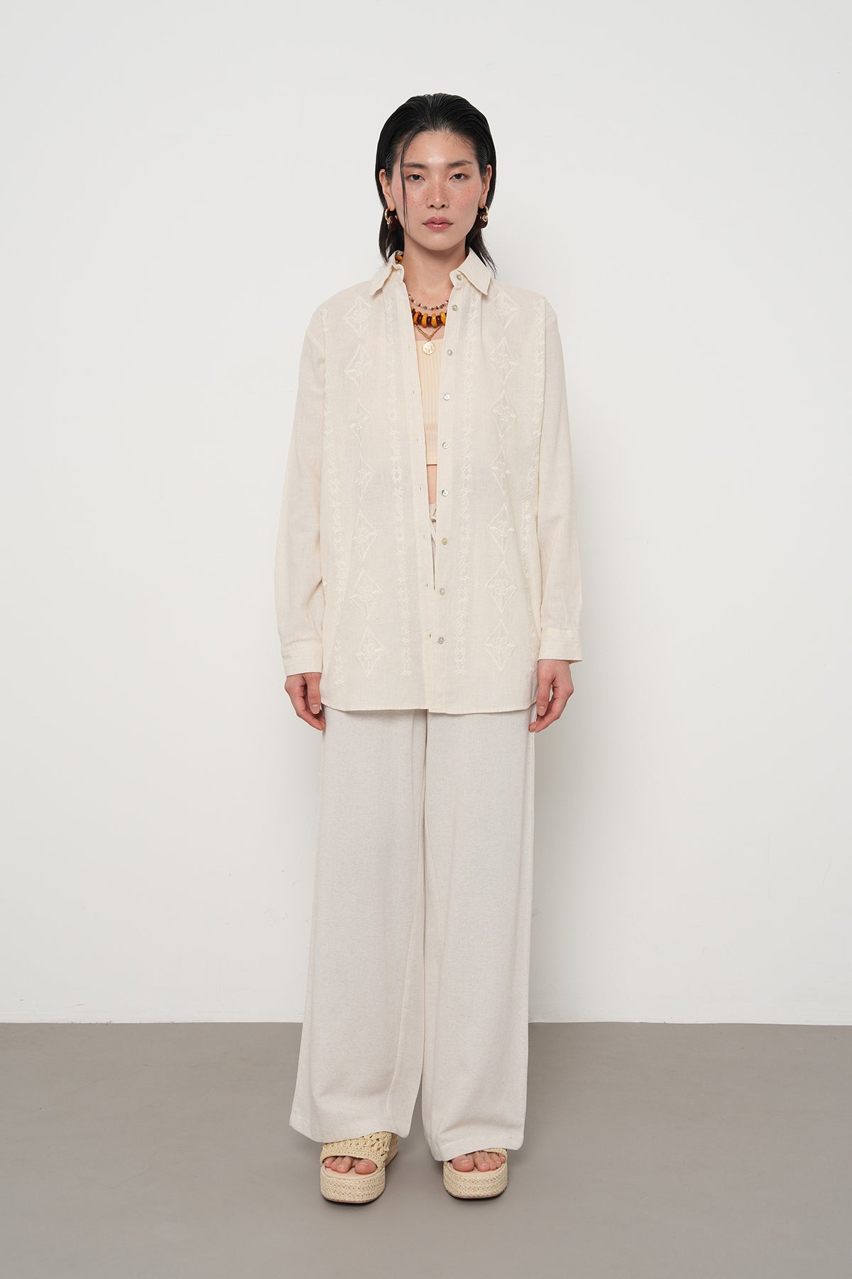 1. Doğal Takım Zarafeti: Gömleğinizi, görsellerdeki gibi benzer doku ve tonlardaki palazzo pantolonlarla kombinleyerek bütünsel bir "saf şıklık" yakalayın. Bu görünüm, yaz akşamları ve şehir stili için sofistike bir tercih olacaktır.