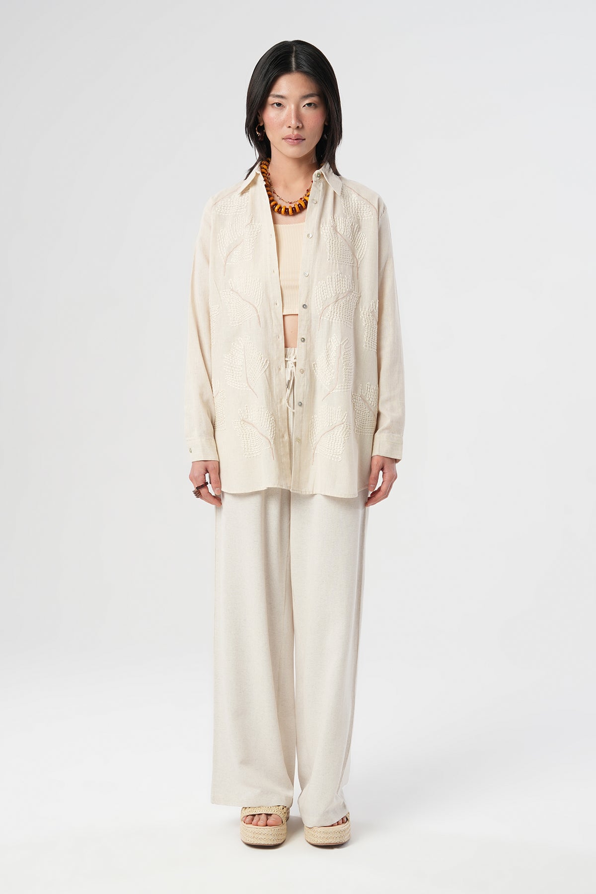 Türkiye’de kendi üretim tesislerimizde özenle hazırlanan bu gömlek, %70 Pamuk ve %30 Keten karışımı sayesinde tamamen doğal ve nefes alan bir yapıya sahiptir. Pamuğun tene dost yumuşaklığı ile ketenin dayanıklılığını bir araya getiren ürün, üzerindeki özel nakış desenleri ve rahat oversize kalıbıyla zahmetsiz bir şıklık sunar.