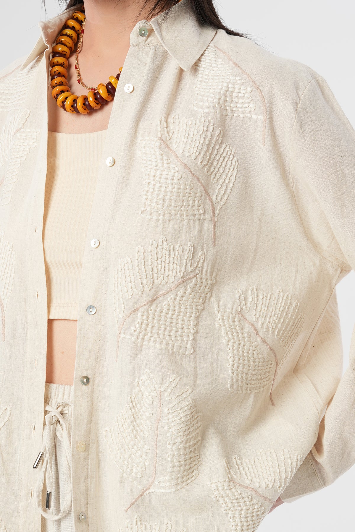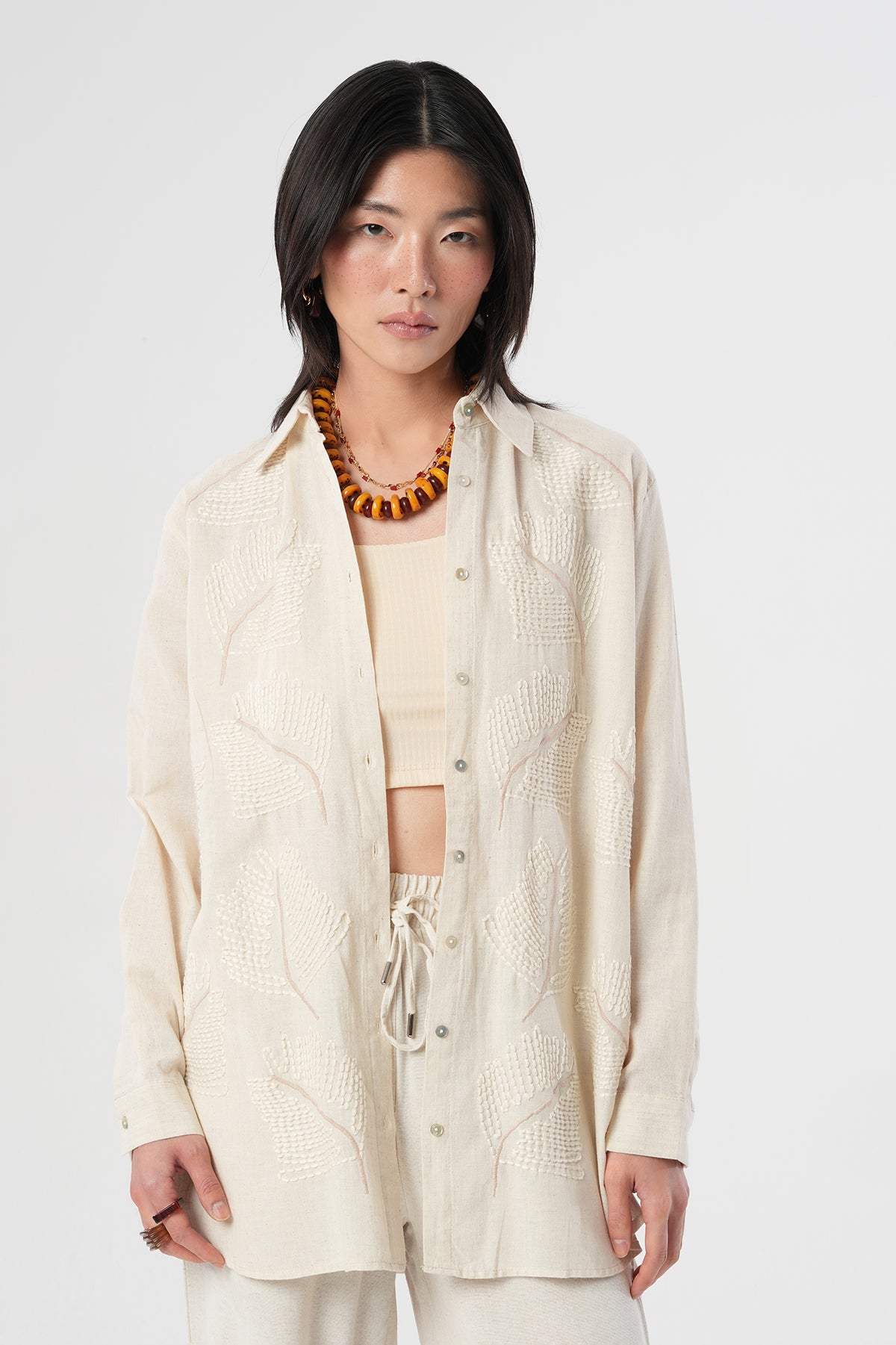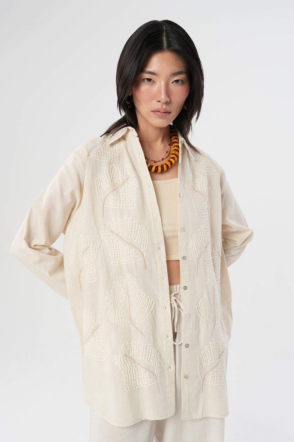 Kadın Etnik Yaprak Nakışlı Pamuk Keten Oversize Gömlek