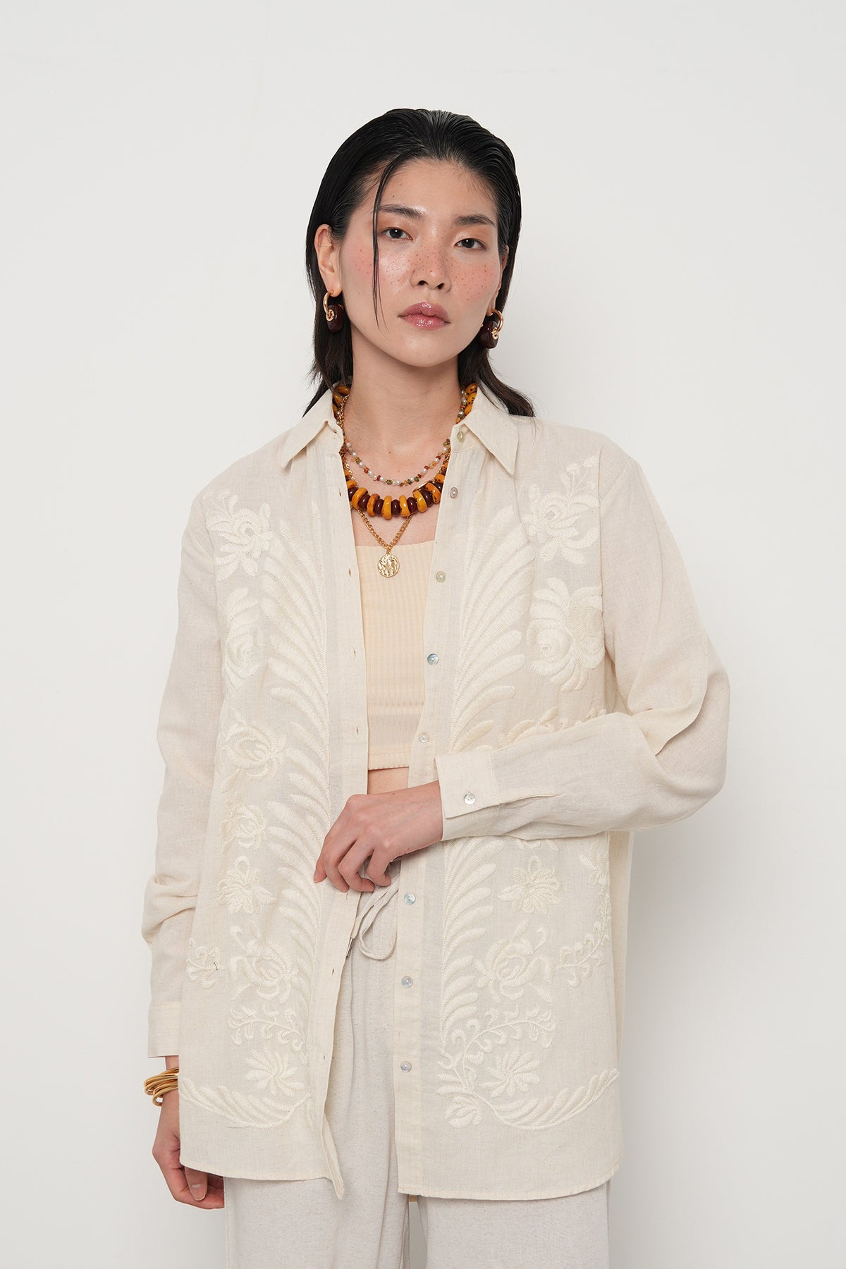 Sanatsal Çiçek Nakışları: Gömleğin üzerine titizlikle işlenen büyük ölçekli çiçek motifleri, ürüne butik bir tasarım havası ve zengin bir görsel derinlik kazandırır.
