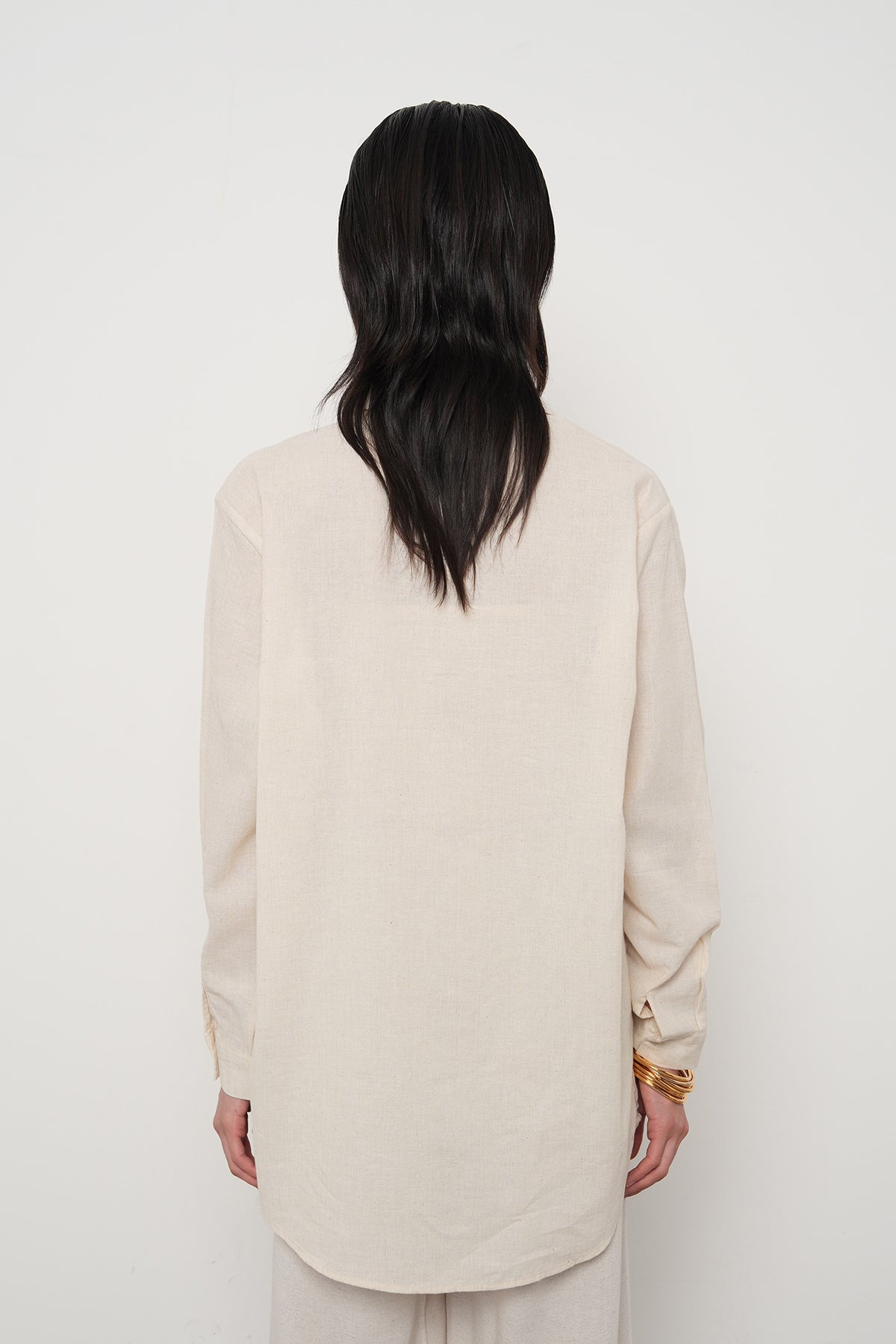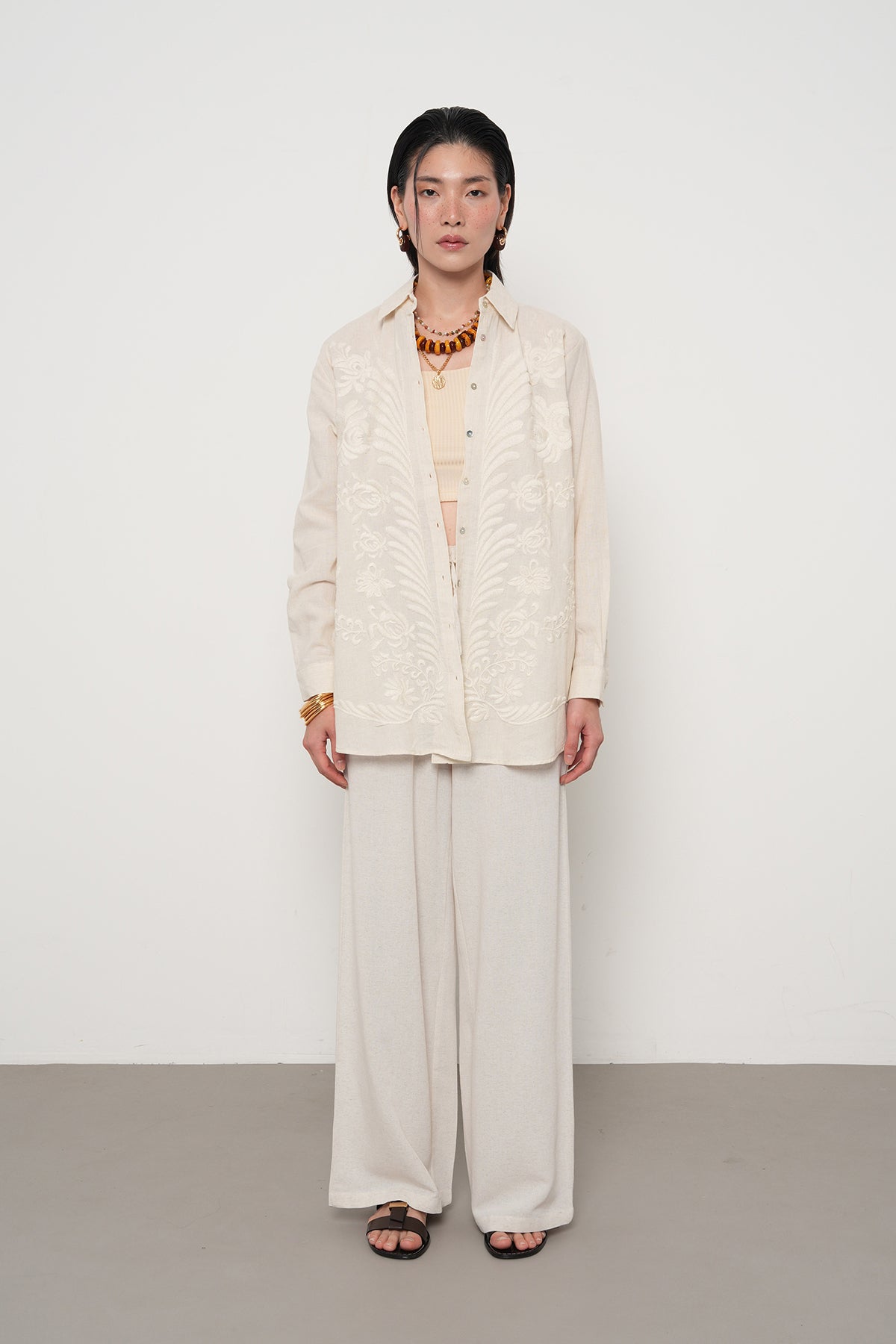 Doğal Takım Zarafeti: Gömleğinizi, görsellerdeki gibi benzer doku ve tonlardaki keten karışımlı palazzo pantolonlarla kombinleyerek bütünsel bir "saf şıklık" yakalayın.