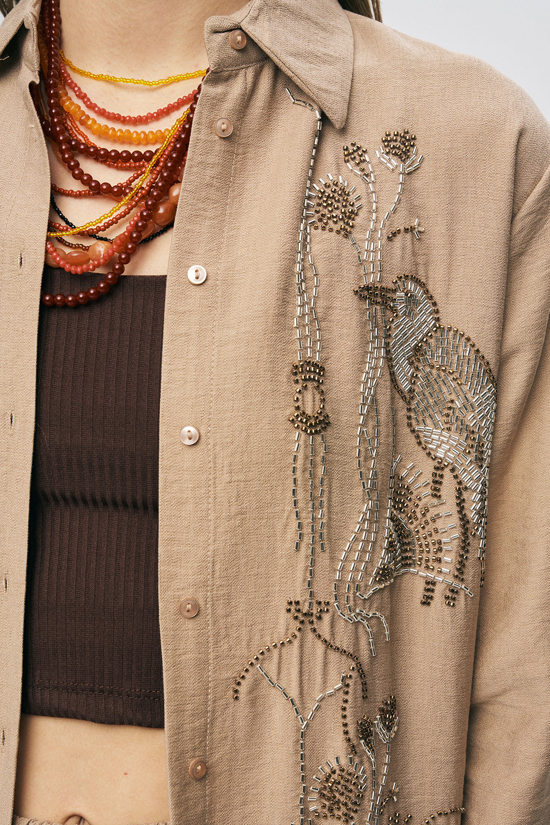 Kadın Oriental Kuş Ve Çiçek Boncuk İşlemeli Oversize Gömlek