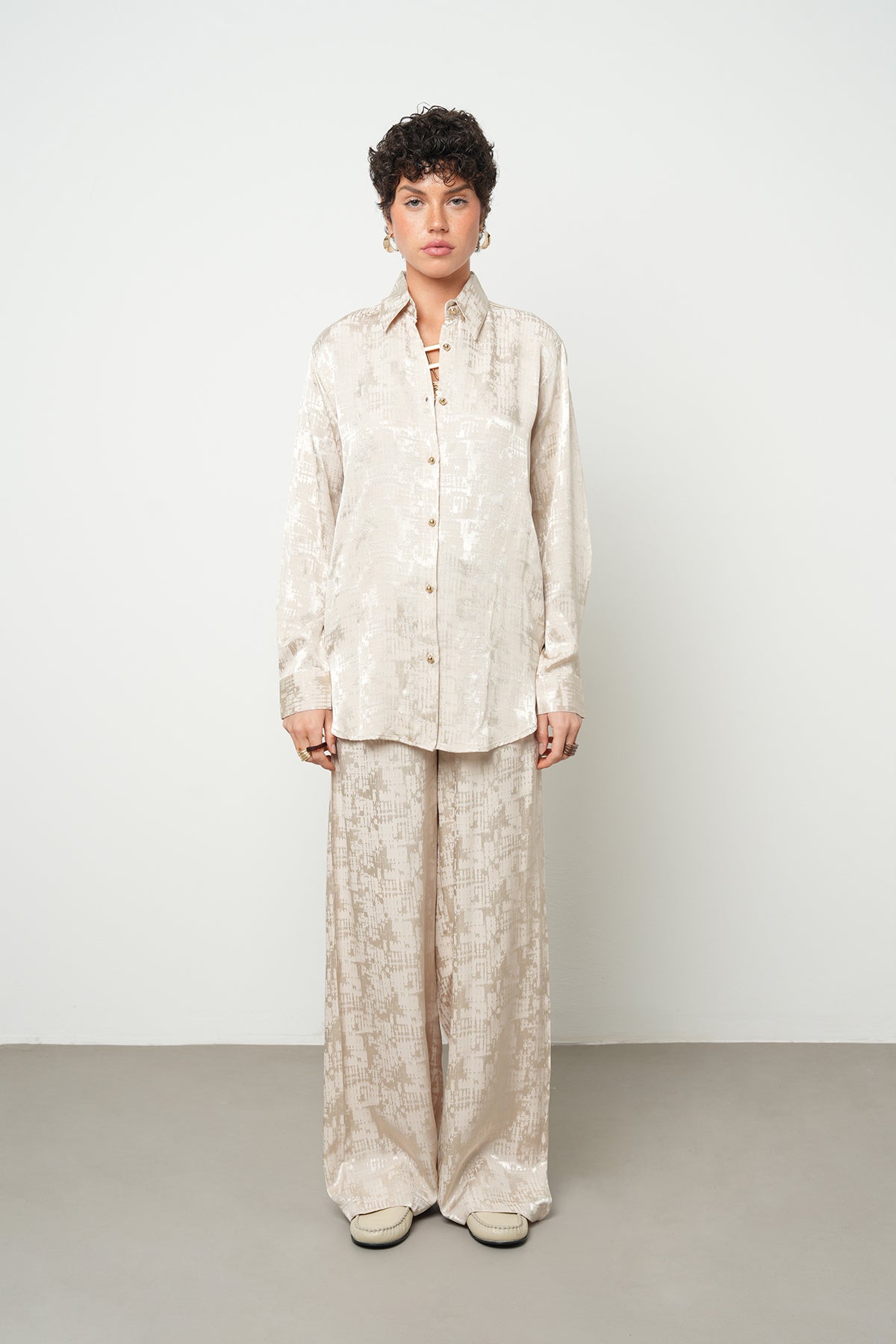 1. Klasik Takım Zarafeti: Gömleğinizi, aynı doku ve renk tonlarına sahip Orfeonegro palazzo pantolonlar ile birleştirerek görseldeki gibi bütünsel bir şıklık yakalayın.