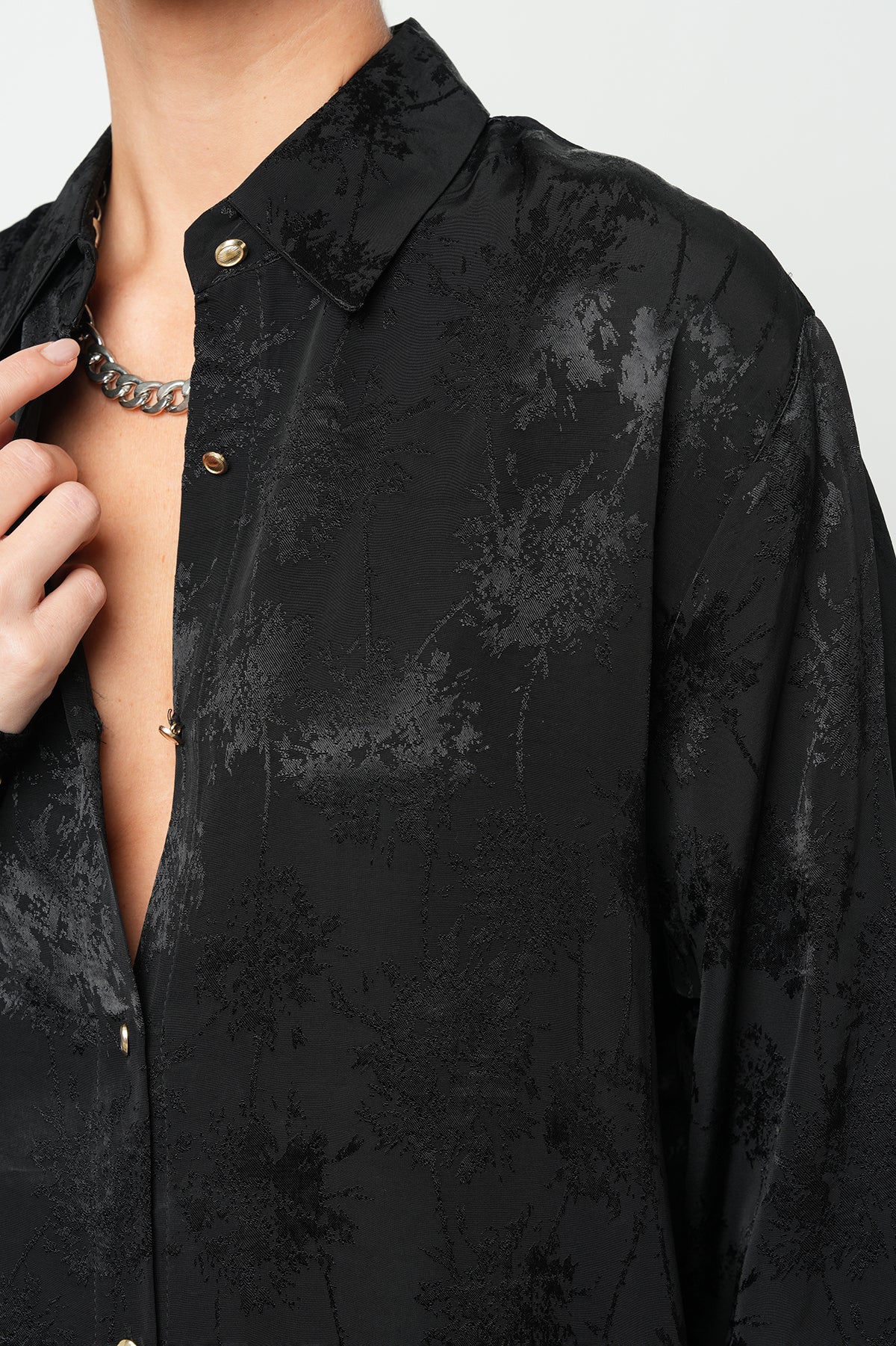 Siyah zemin üzerine ustalıkla işlenen kendinden çiçek desenleriyle tasarlanan bu gömlek, 2026 "sessiz lüks" trendini dökümlü ve eforsuz kesimiyle yeniden yorumlar. Rayon ve viskon liflerinin birleşimiyle oluşan akışkan doku, kumaşın üzerindeki bitkisel motiflerin ışığa göre değişen zarif parıltısını vurgularken silüetinize her hareketinizde asil bir duruş katar. Klasik yaka detayı ve boydan şık düğmeli tasarımıyla hem resmi ortamlara hem de günlük şıklığa uyum sağlayan bu tasarım, oversize kalıbı sayesinde zahmetsizce stil sahibi bir görünüm elde etmenizi sağlar.