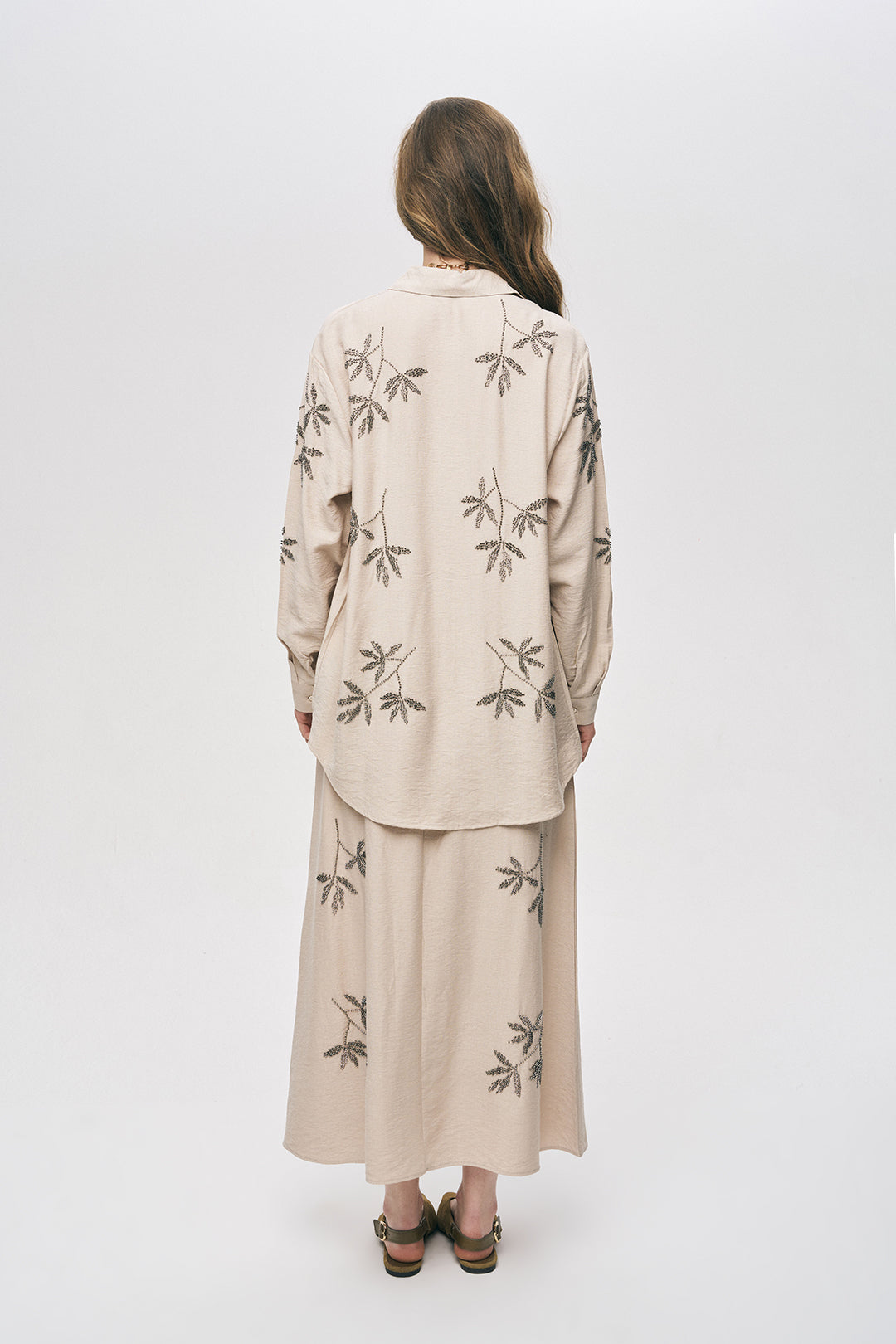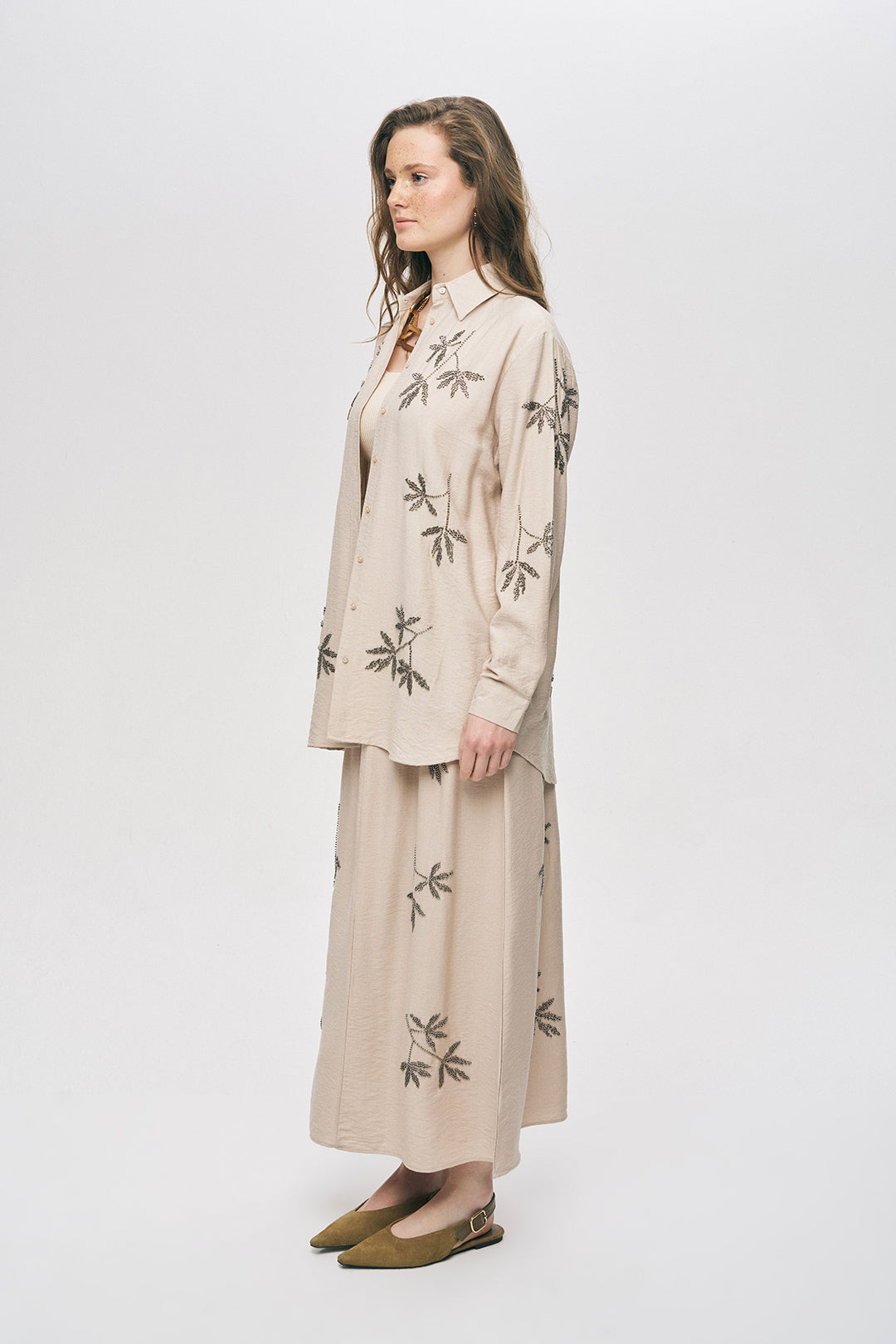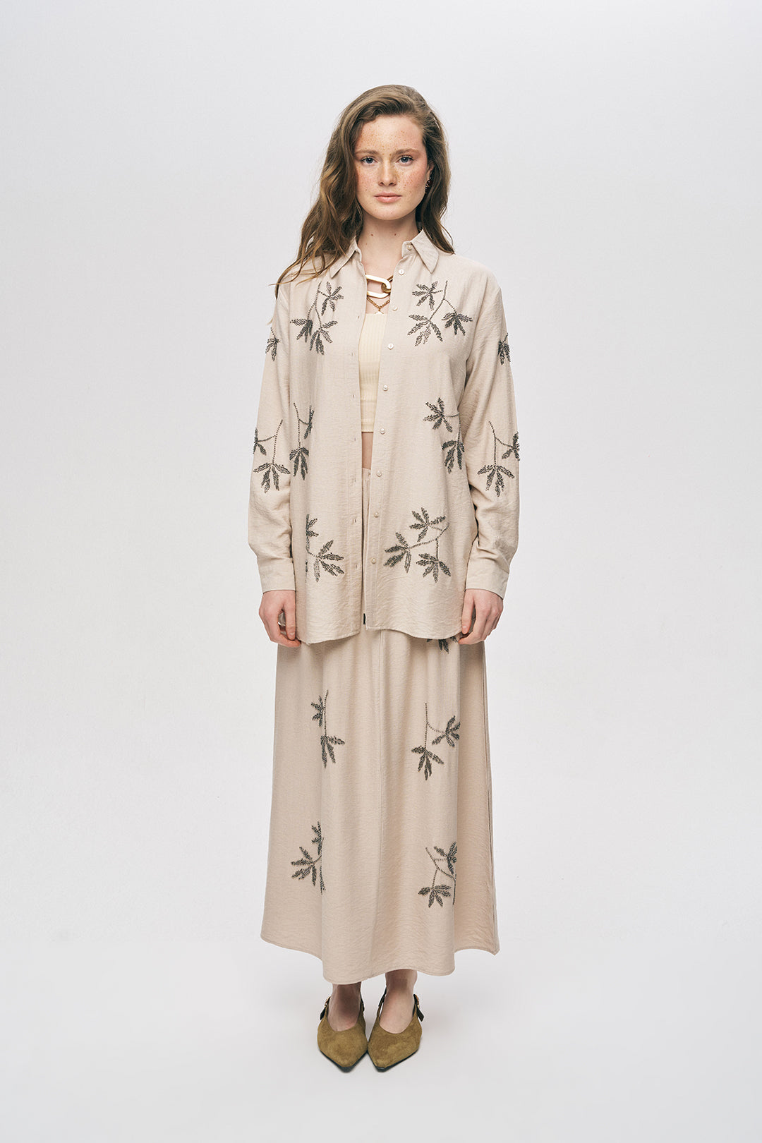Botanik Set Şıklığı: Gömleğinizi, aynı renk ve nakış detaylarına sahip Yaprak İşlemeli Maxi Etek ile eşleştirerek sezonun en güçlü "takım" görünümünü yakalayın.