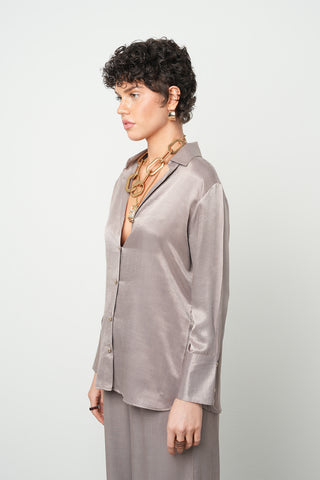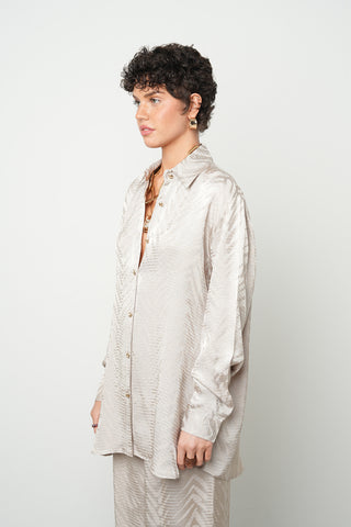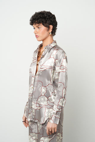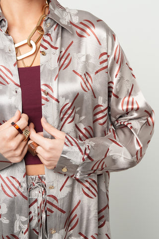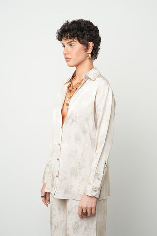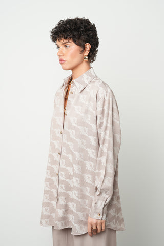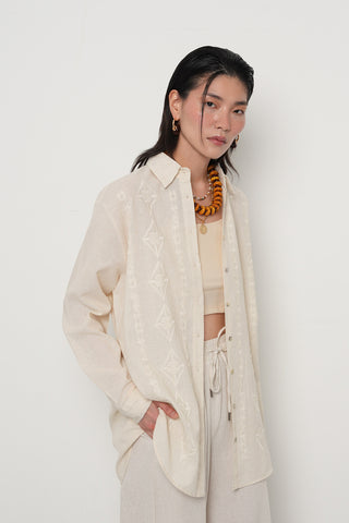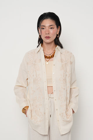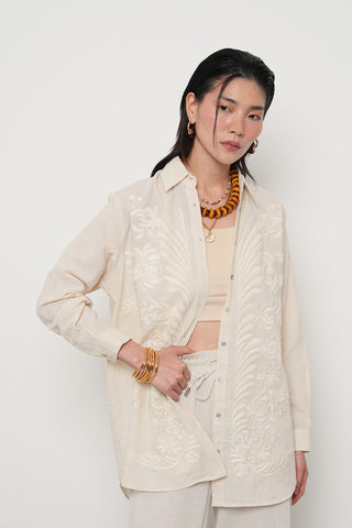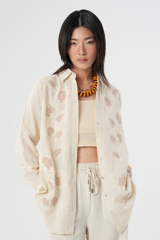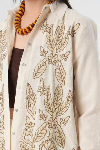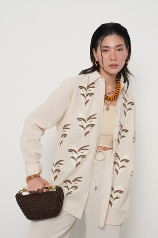 Kadın Kahverengi Yapraklı Nakış İşlemeli Pamuk Keten Karışımlı Oversize Gömlek