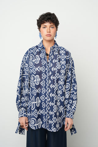 Kadın Lacivert Etnik Desenli Oversize Pamuklu Gömlek