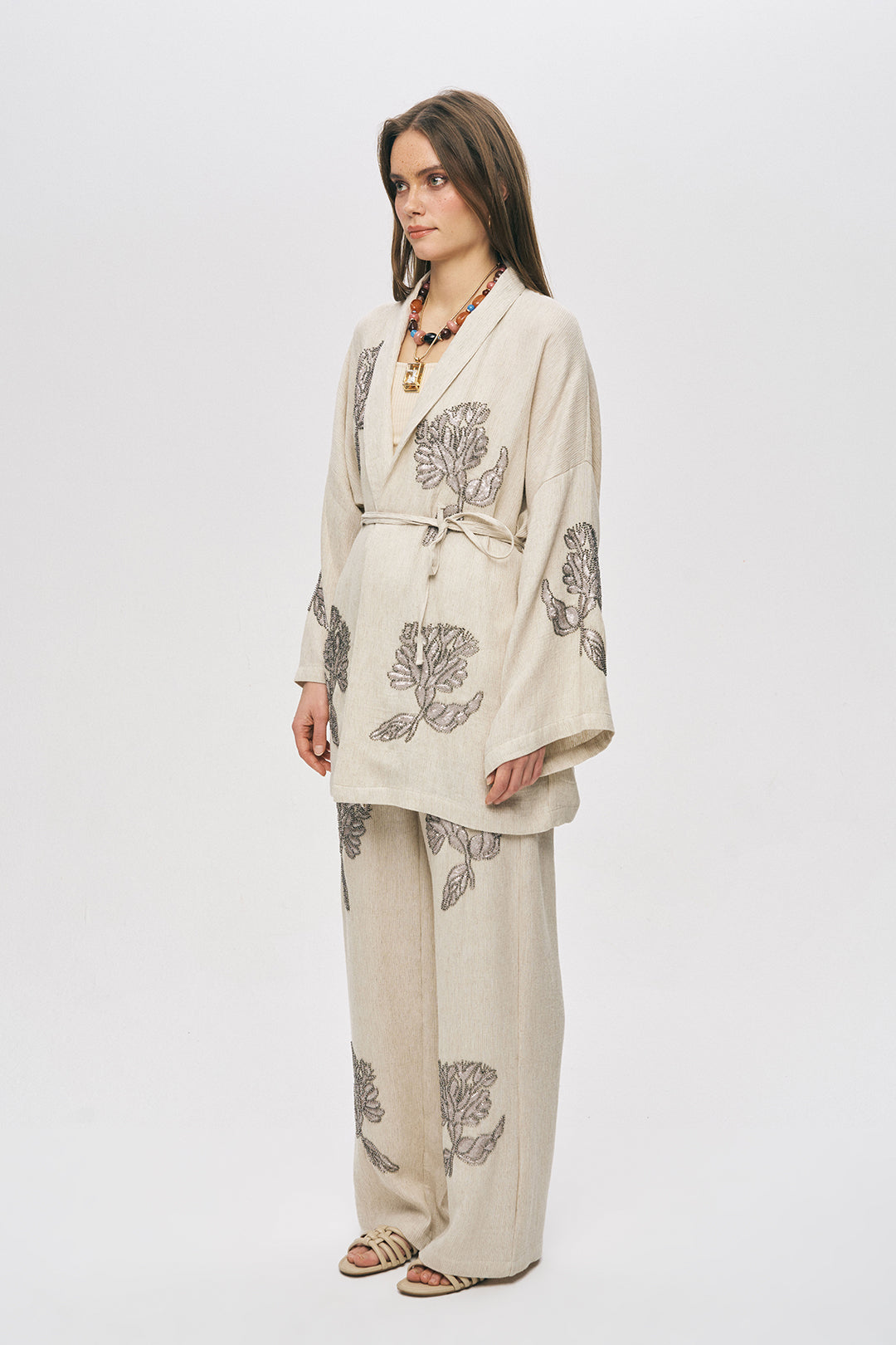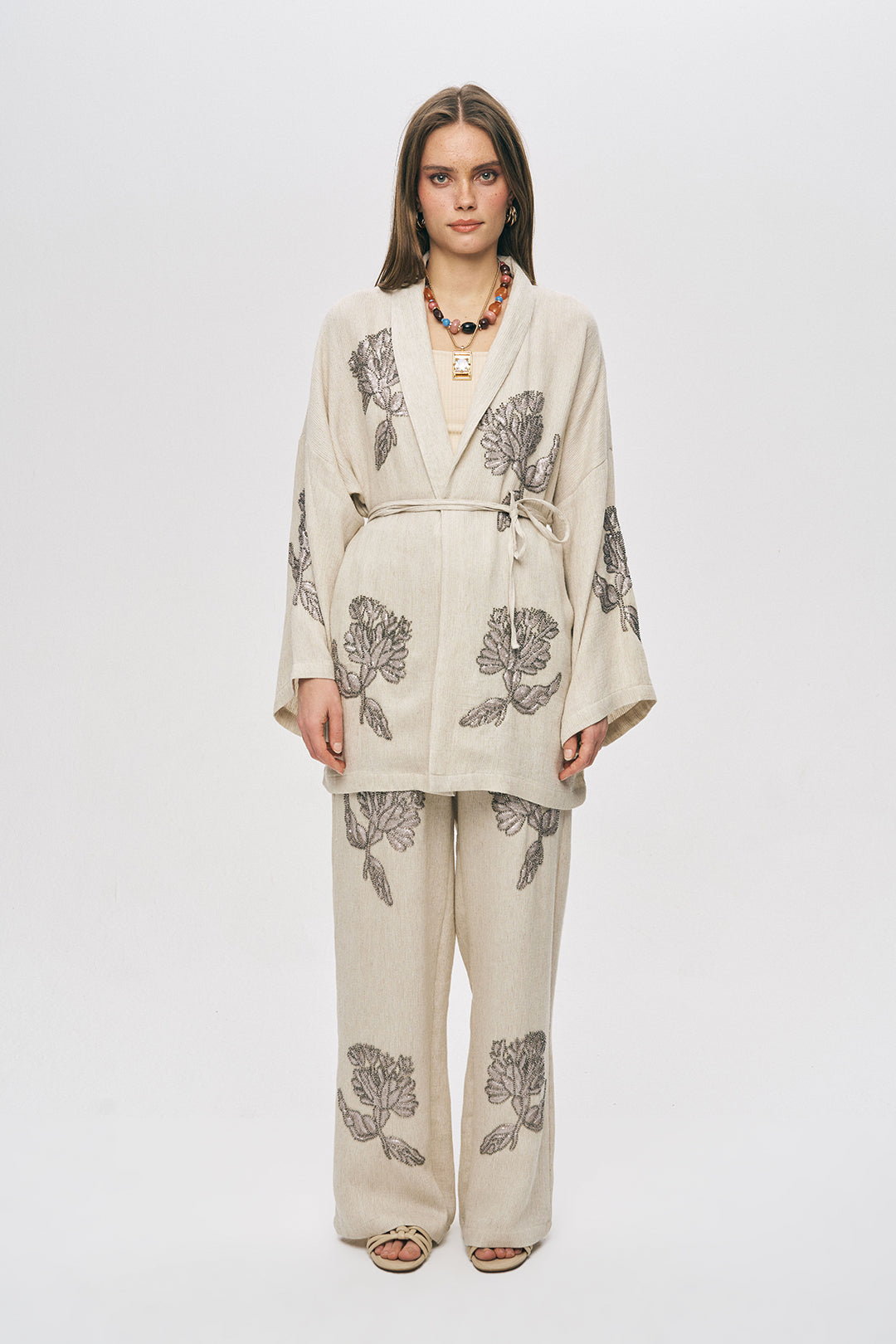 Tam Flora Natur Görünümü: Kimononuzu, serinin tamamlayıcısı olan Kadın Flora Natur Nakışlı Pantolon ile birleştirerek yüksek moda haftası etkisinde bir set oluşturun.