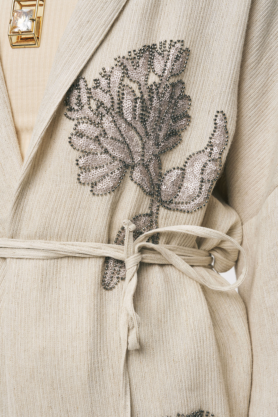 Türkiye’de kendi üretim tesislerimizde yüksek kalite standartlarıyla hazırlanan bu kimono, %43 Viskon, %43 Keten ve %14 Polyamid karışımlı özel kumaşıyla hem doğal bir zarafet hem de dayanıklı bir yapı sunar. Üzerindeki titizlikle işlenmiş zarif çiçek nakışları ve beli vurgulayan ip bağlama detayı, oversize kesimin sunduğu konforu feminen bir dokunuşla mükemmel şekilde dengeler. 2026 "modern bohem" trendine uygun olarak tasarlanan bu parça, gardırobunuzun en çok yönlü ve sanatsal parçalarından biri olacak.