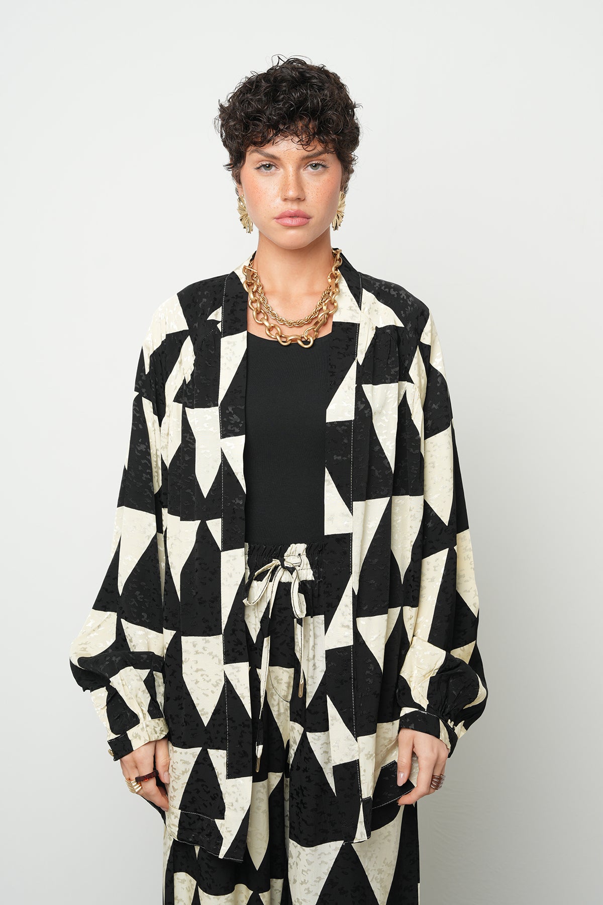 İkonik Grafik Takım Görünümü: Kimononuzu, koleksiyonun aynı doku ve geometrik desenine sahip olan Geometrik Üçgen Desenli Palazzo Pantolon ile birleştirerek podyum şıklığını yansıtan iddialı bir "total look" oluşturun.