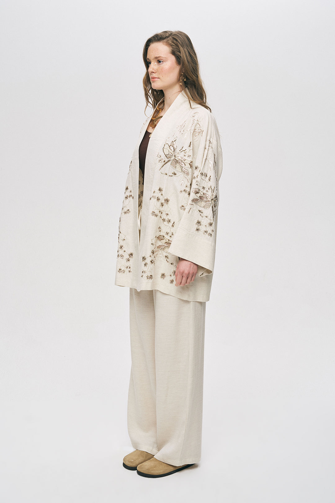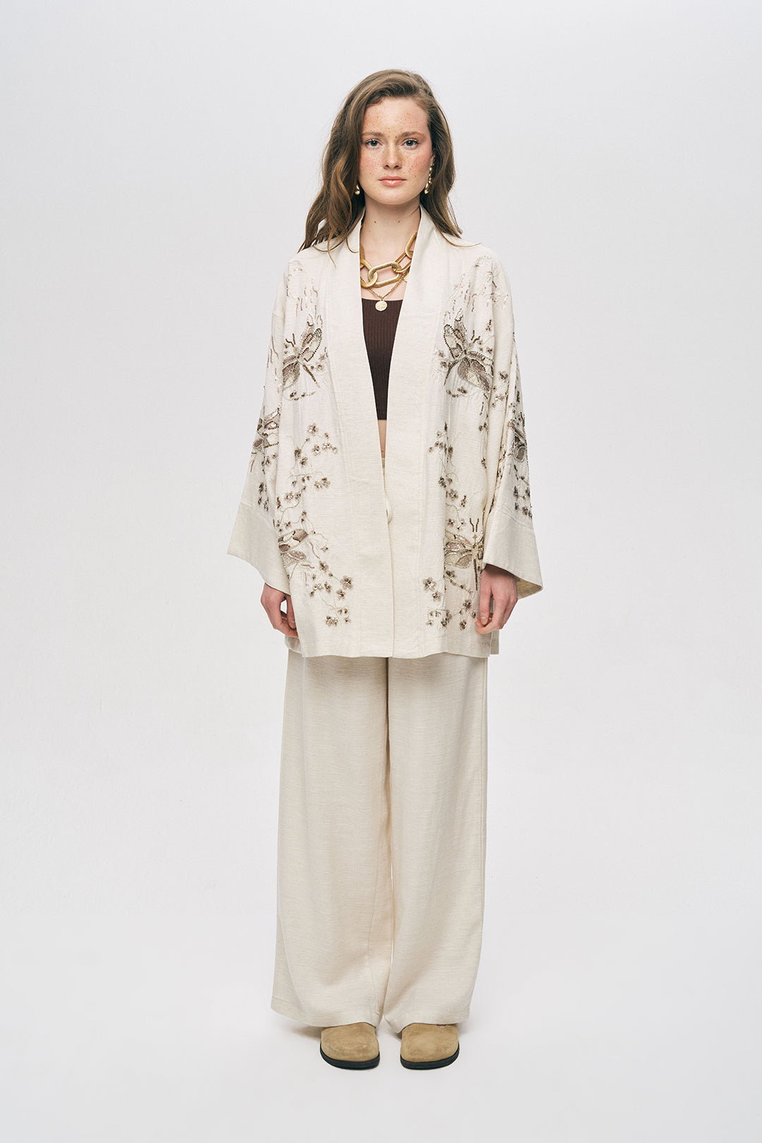 Naturel Işıltı Takımı: Kimononuzu, görseldeki gibi aynı dokuya ve işlemelere sahip Kelebek Nakışlı Pantolon ile birleştirerek 2026'nın en güçlü monokrom takımını oluşturun.