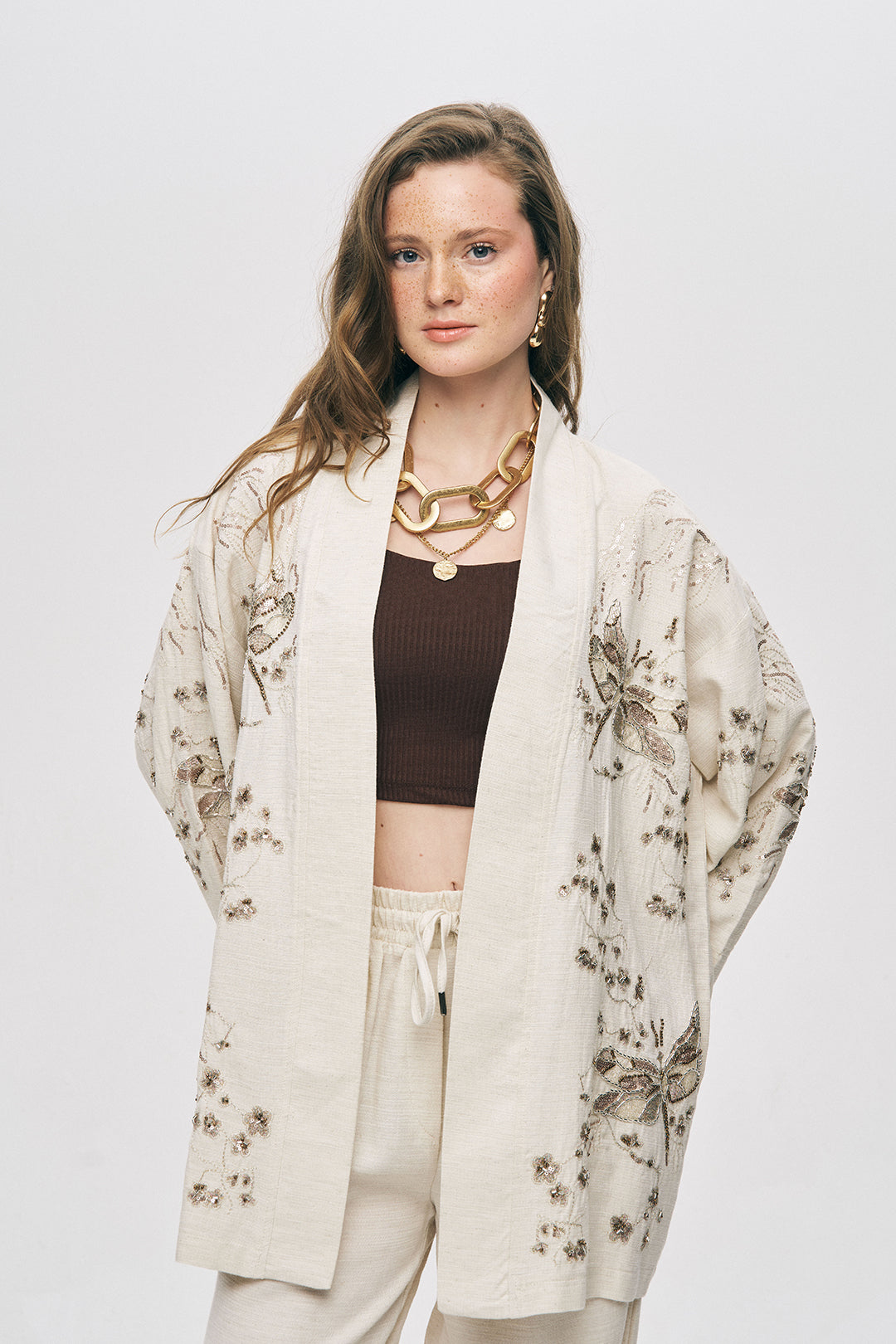 Türkiye’de kendi üretim tesislerimizde yüksek kalite standartlarıyla hazırlanan bu özel kimono; %50 Pamuk, %30 Ten.cel ve %20 Keten karışımıyla tamamen doğal ve nefes alan bir dokuya sahiptir. Tasarımın omuz ve ön panellerine işlenen el işçiliği boncuk ve payet detayları, rahat kesimiyle birleşerek doğal şıklığı ışıltılı bir lüksle harmanlar. 2026 "naturel ışıltı" trendine uygun olarak tasarlanan bu parça, zanaatkar dokunuşları stilinize taşır.