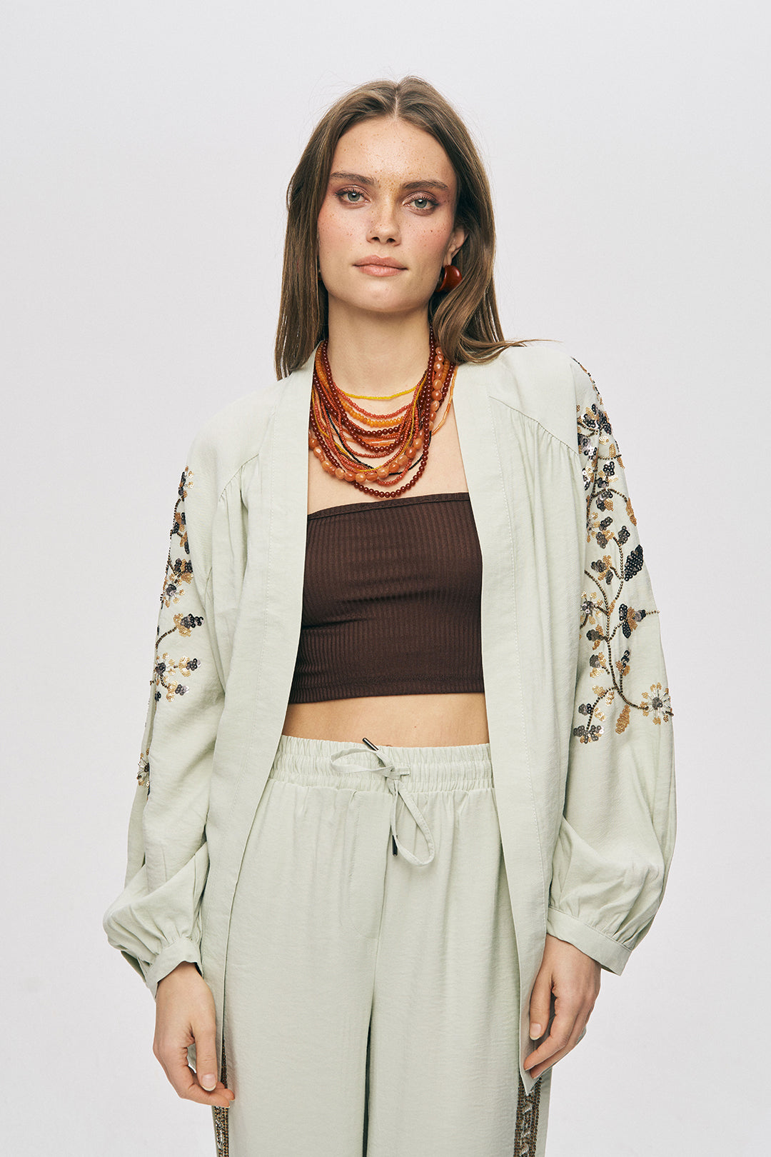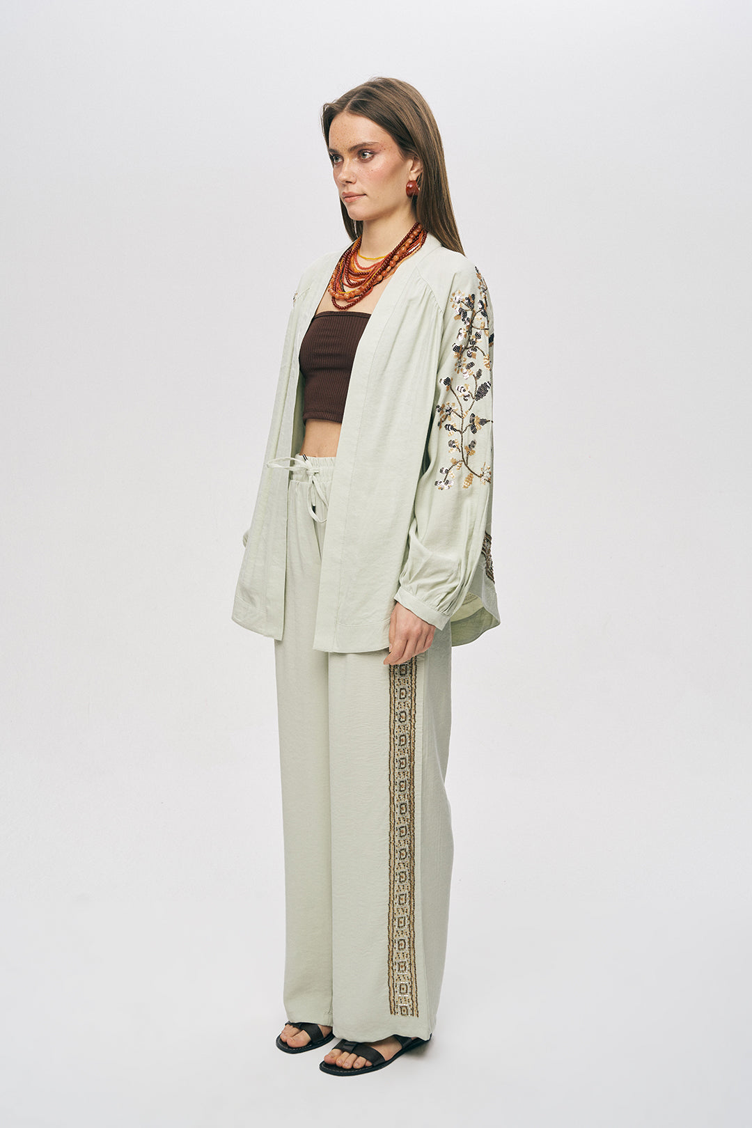 1. Koleksiyon İmzası: Kimononuzu, "Zarif Işıltı" serisinin Yanı Boncuk İşlemeli Modal Pantolonu ile tamamlayarak sezonun en iddialı ve bütünsel şıklığını yaratın.