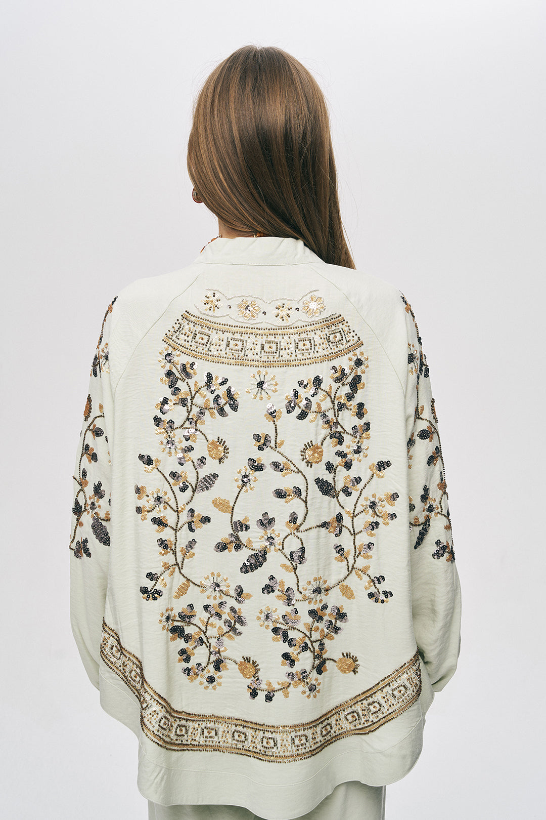 • Görkemli El İşçiliği: Sırt panelini kaplayan floral motifli payet işlemeler ve geometrik boncuklu bordürler, ürünü bir giysiden çok bir sanat eserine dönüştürür.