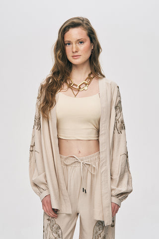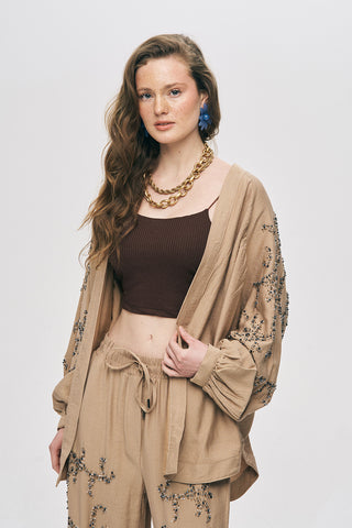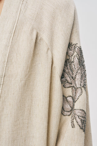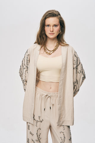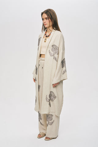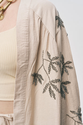Kadın Boncuk İşlemeli Pamuk-Keten Natur Oversize Kimono