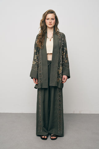 Kadın Flora Natur Nakış İşlemeli Geniş Kesim Oversize Kimono