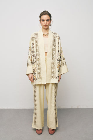 Kadın Etnik Modern Boncuk İşlemeli Natur Oversize Kimono