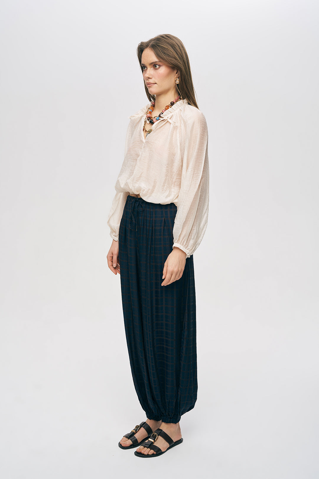 • Manken Bilgisi: 1.77 cm boyundaki manken üzerinde bluzun dökümlü ve büzgülü formu sergilenmektedir.