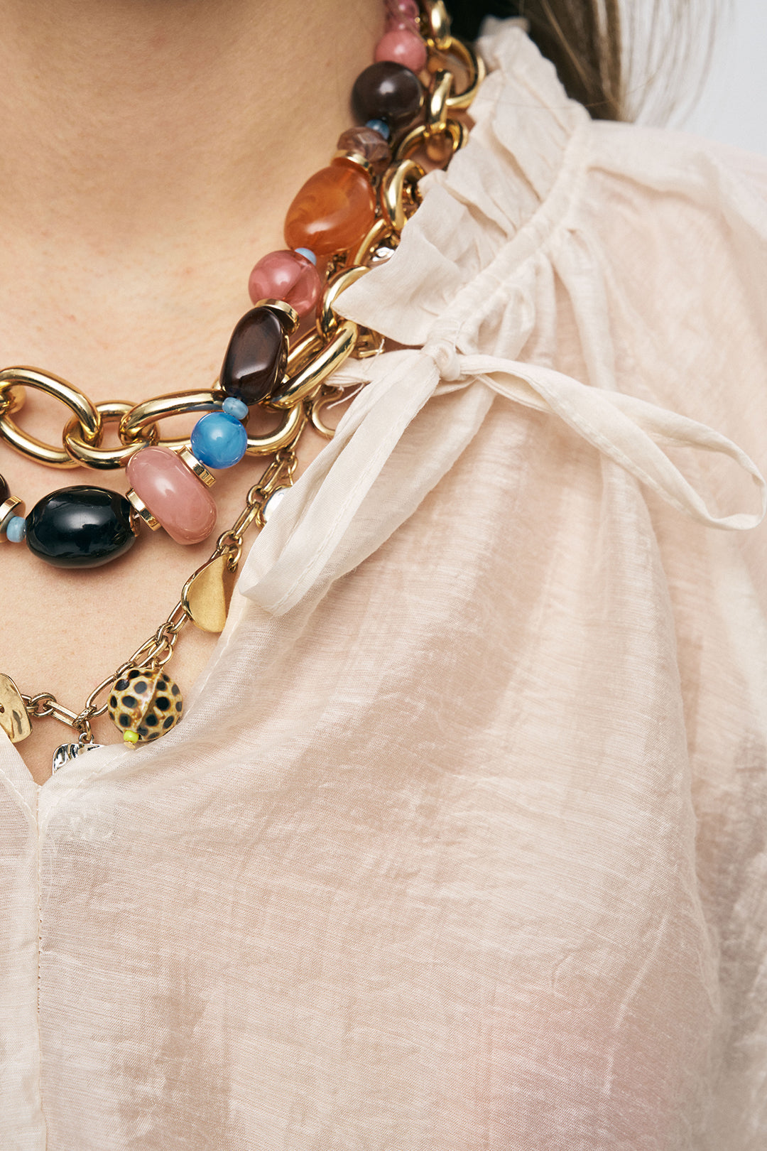 2. Modern Aksesuar: Yaka detayını ön plana çıkarmak için büyük taneli ahşap veya doğal taşlı kolyeler tercih ederek stilinizi güçlendirin.