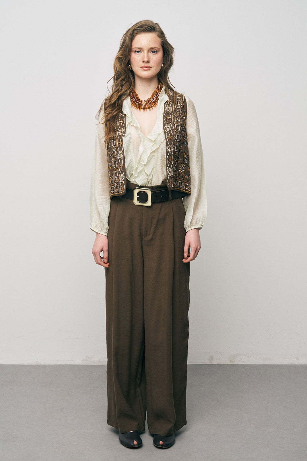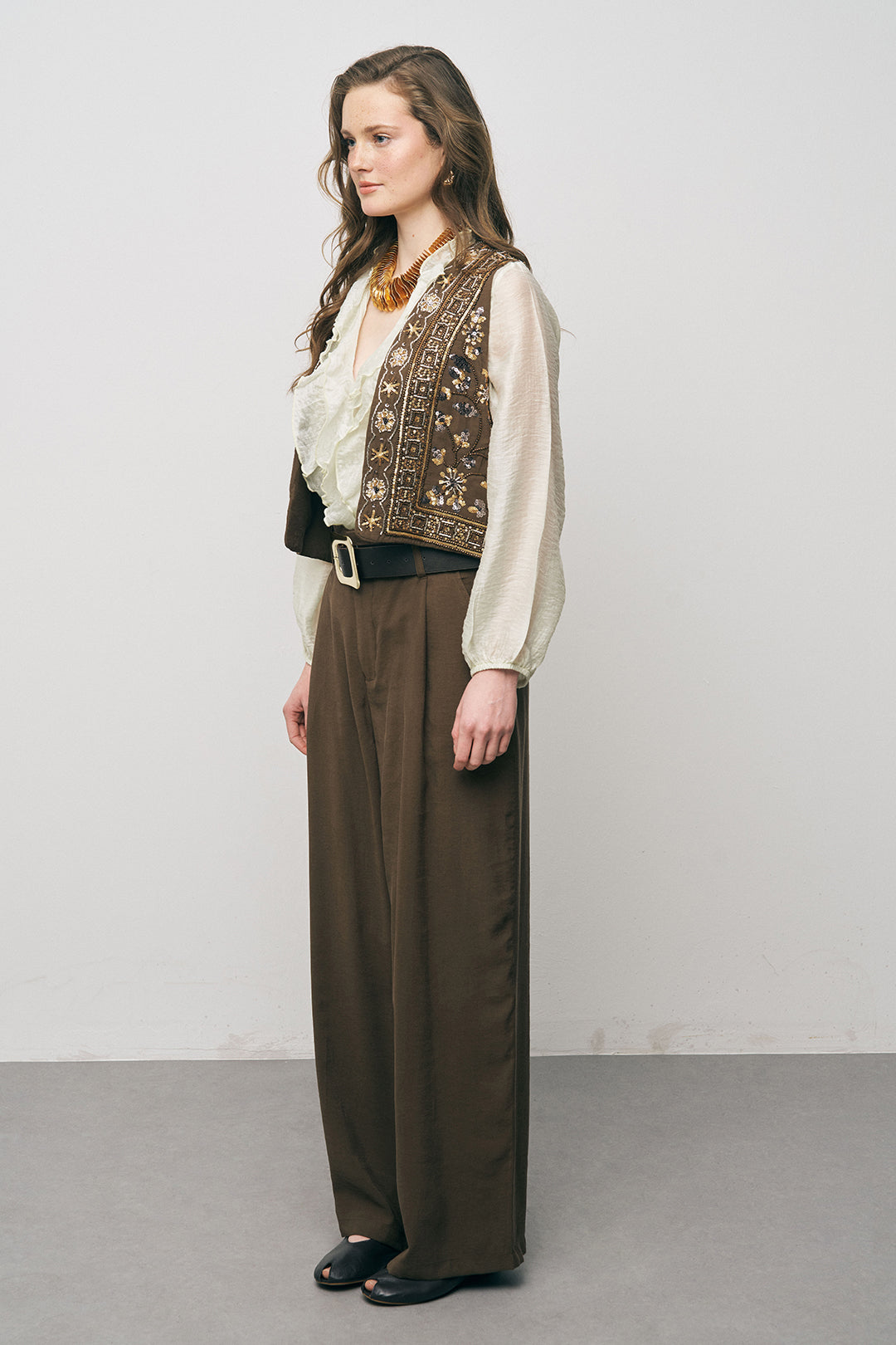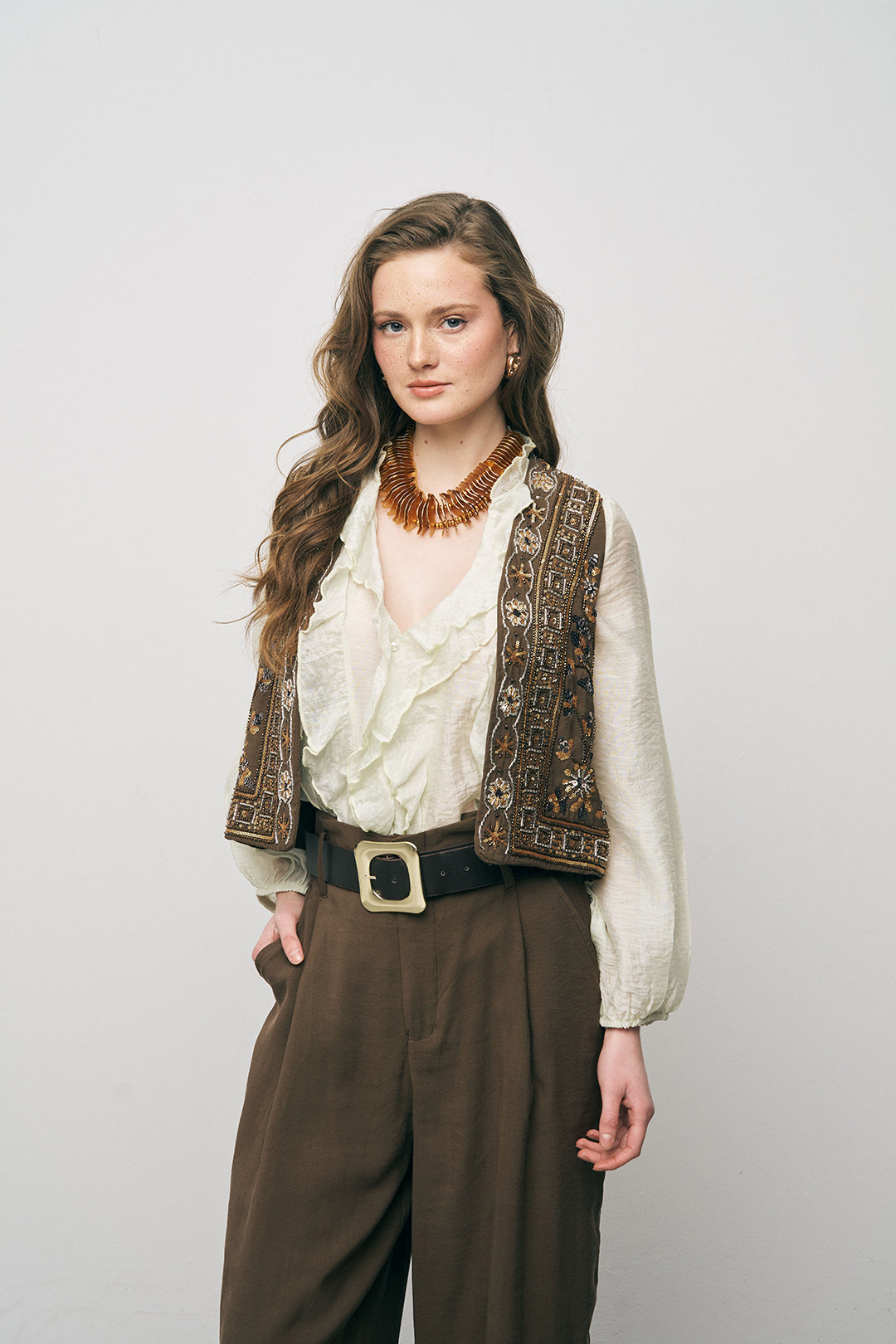 1. Bohem Lüks: Yeleğinizi görseldeki gibi fırfırlı şifon gömlekler ve yüksek bel kahve tonlarında pantolonlarla kombinleyerek 2026'nın modern bohem tarzını yakalayın.