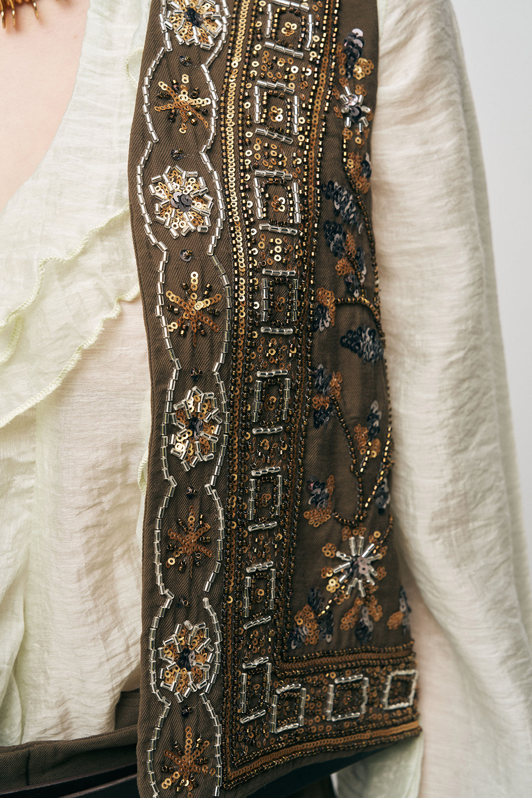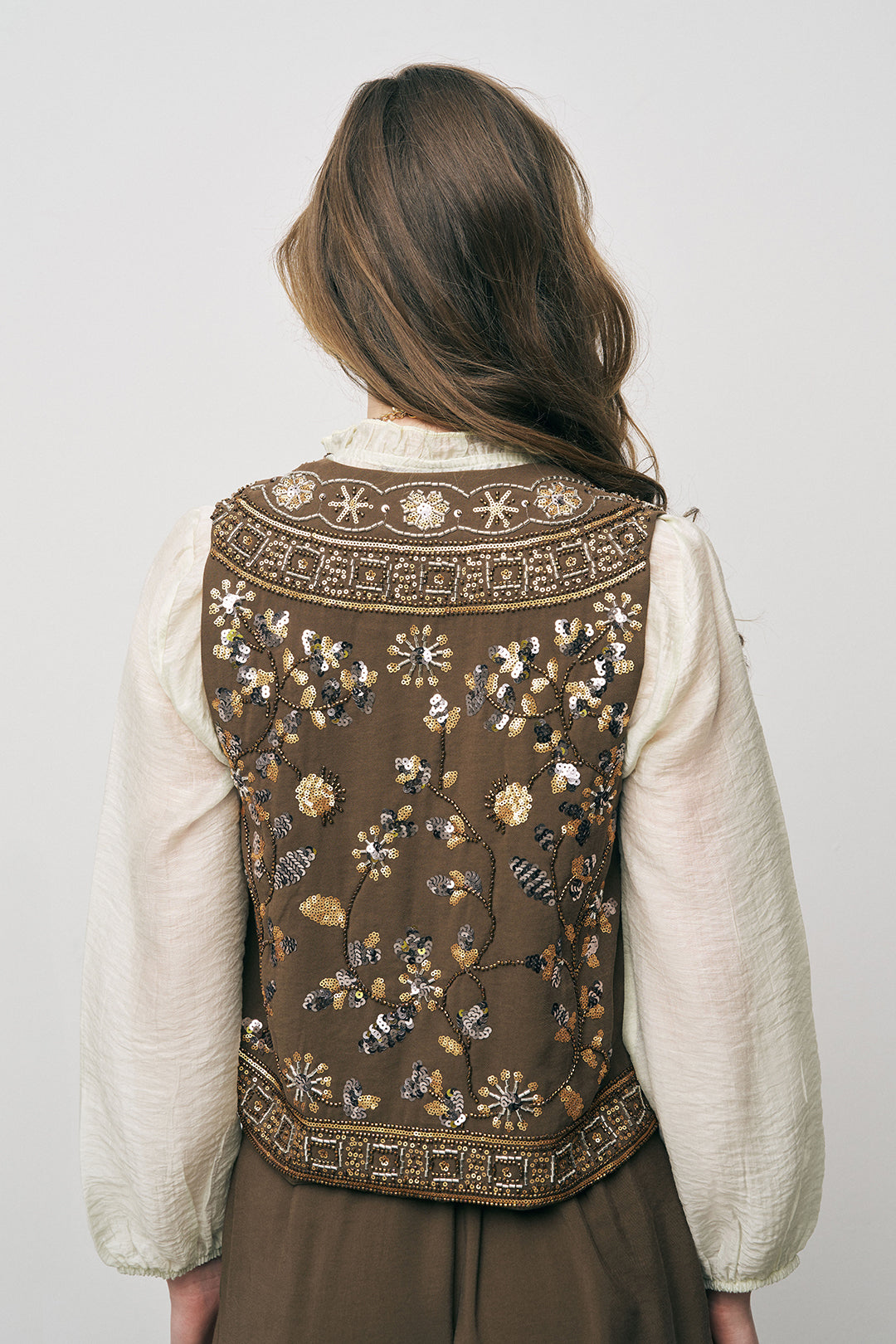 • Zengin El İşçiliği: Yeleğin hem ön hem de arka kısmında yer alan geometrik ve floral boncuk işlemeleri, her açıdan göz alıcı bir derinlik sunar.