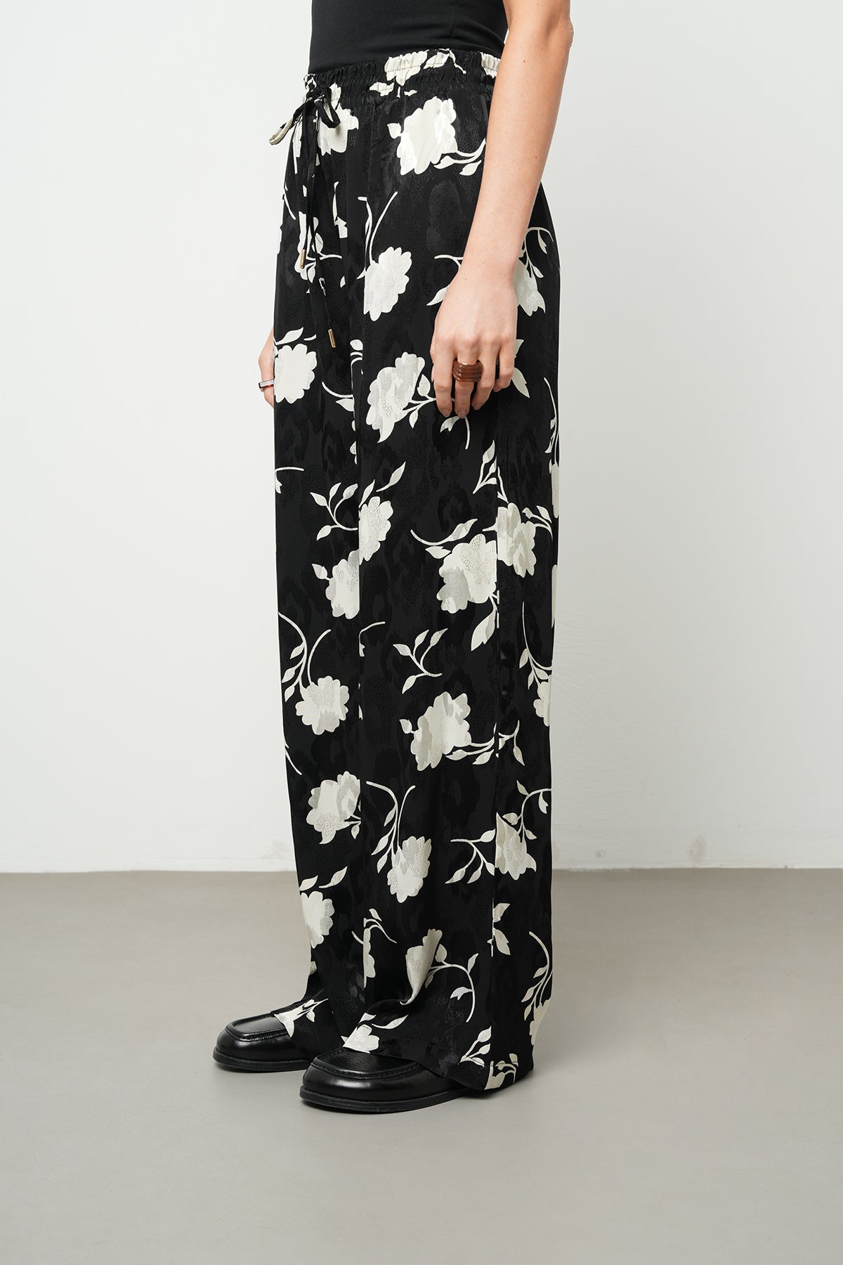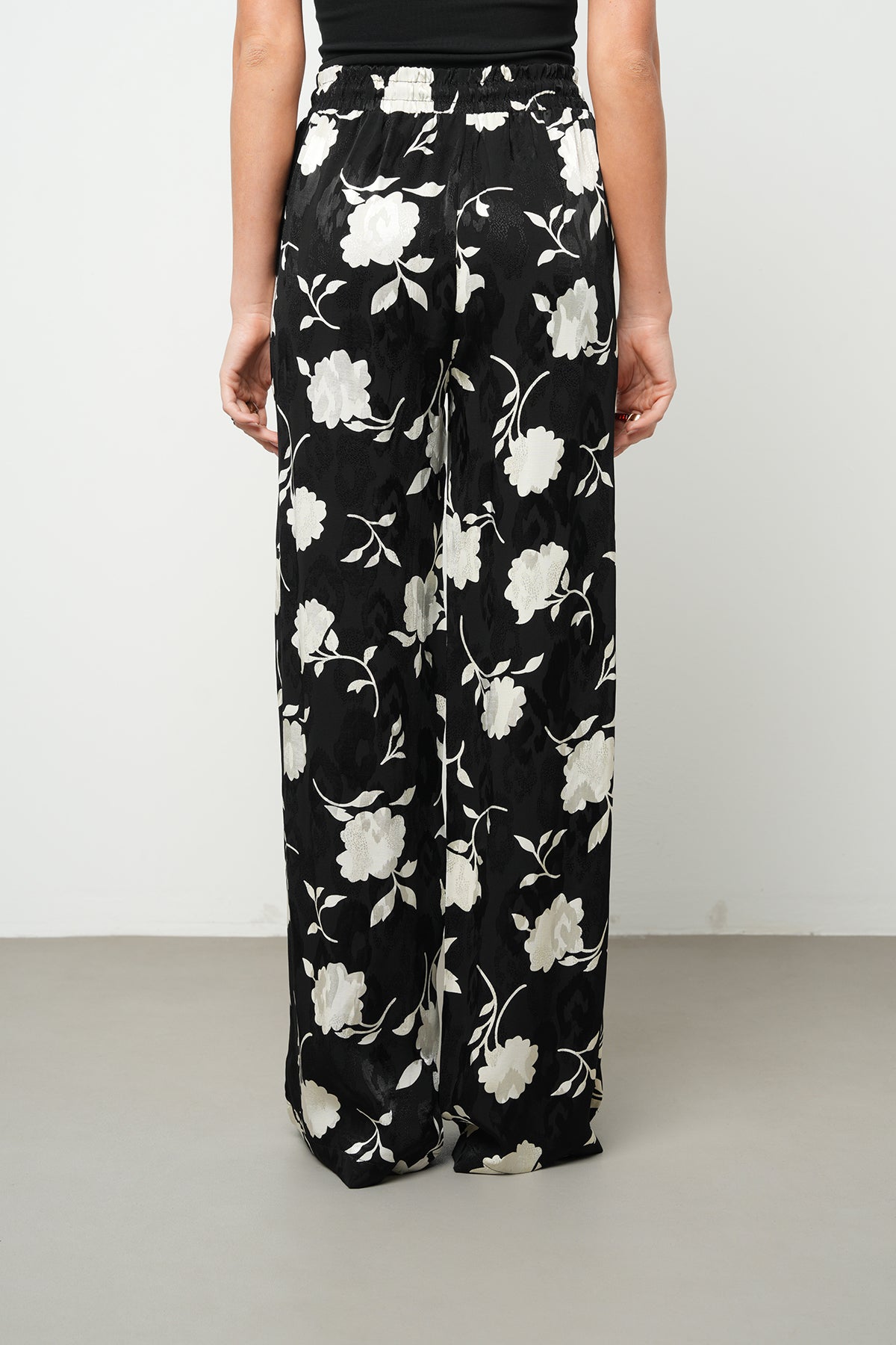 Kadın Modern Çiçek Desenli Siyah - Beyaz Beli Lastikli Palazzo Pantolon