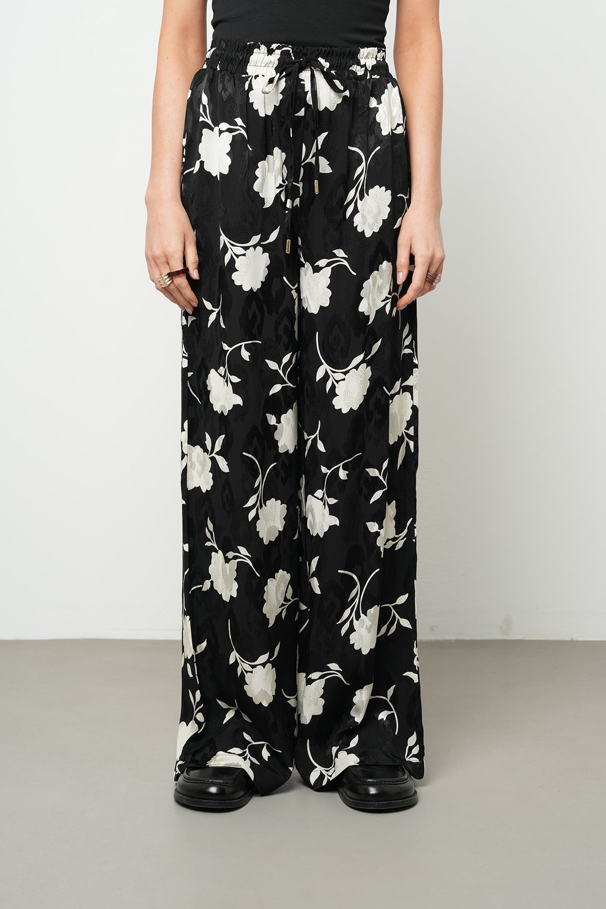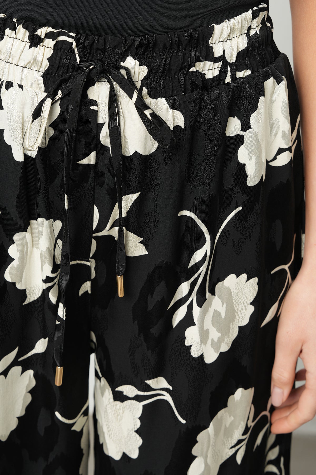 Siyah zemin üzerine kontrast oluşturan beyaz floral motiflerle tasarlanan bu pantolon, 2026 "akışkan zarafet" trendini yansıtan dökümlü palazzo kesimiyle öne çıkar. Kumaşın rayon ve viskon birleşiminden gelen doğal parlaklığı, desenlerin canlılığını vurgularken silüetinize sofistike bir hava katar. Belindeki lastik ve bağcık detayı sayesinde kişiselleştirilebilir konfor sunan bu tasarım, hem günlük şıklıkta hem de özel davetlerde kendinizi özgür ve zarif hissetmenizi sağlar.