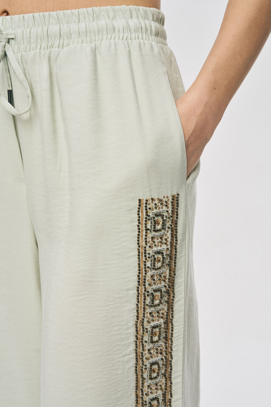 Türkiye’de kendi üretim tesislerimizde "Zarif Işıltı" koleksiyonuna özel olarak tasarlanan bu pantolon; %90 Modal ve %10 Polyester karışımının doğal lifleri sayesinde ipeksi bir yumuşaklığa ve yüksek nefes alma özelliğine sahiptir. Pantolonun yan şeritleri boyunca uzanan el işçiliği boncuk detayları, 2026 yaz modasının "modern bohem" tavrını vurgularken; beli bağcıklı ve dökümlü yapısı en sıcak günlerde bile serin ve özgür hissettirir.