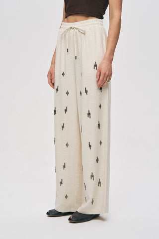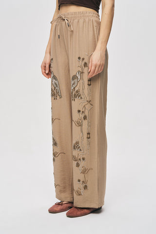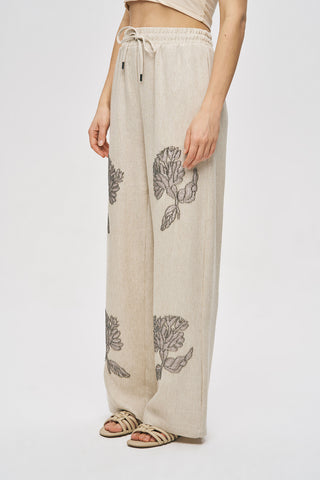 Kadın Flora Natur Nakış İşlemeli Keten Karışımlı Pantolon