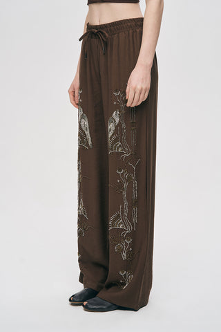 Kadın Oriental Kuş ve Çiçek Boncuk İşlemeli Dökümlü Palazzo Pantolon