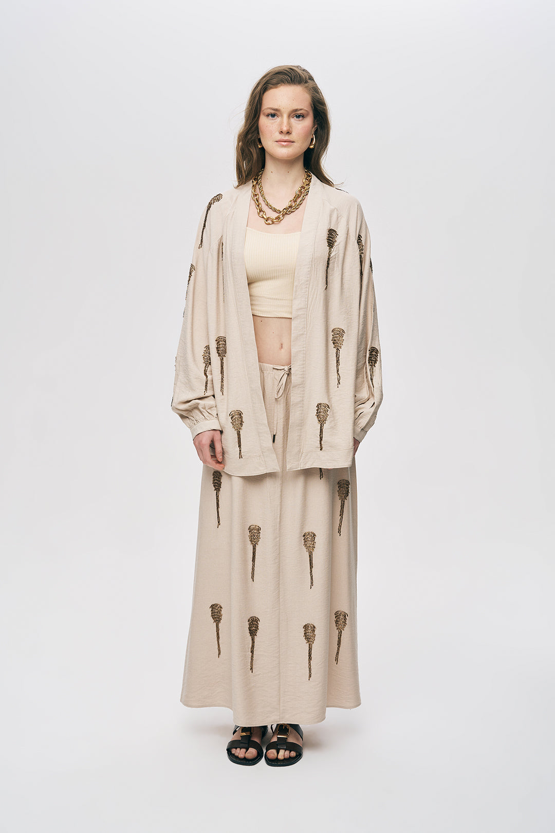 Monokrom Luxury Takım: Kimononuzu, görseldeki gibi aynı doku ve renk tonuna sahip Boncuk İşlemeli Uzun Etek ile birleştirerek 2026'nın en şık monokrom setini oluşturun.
