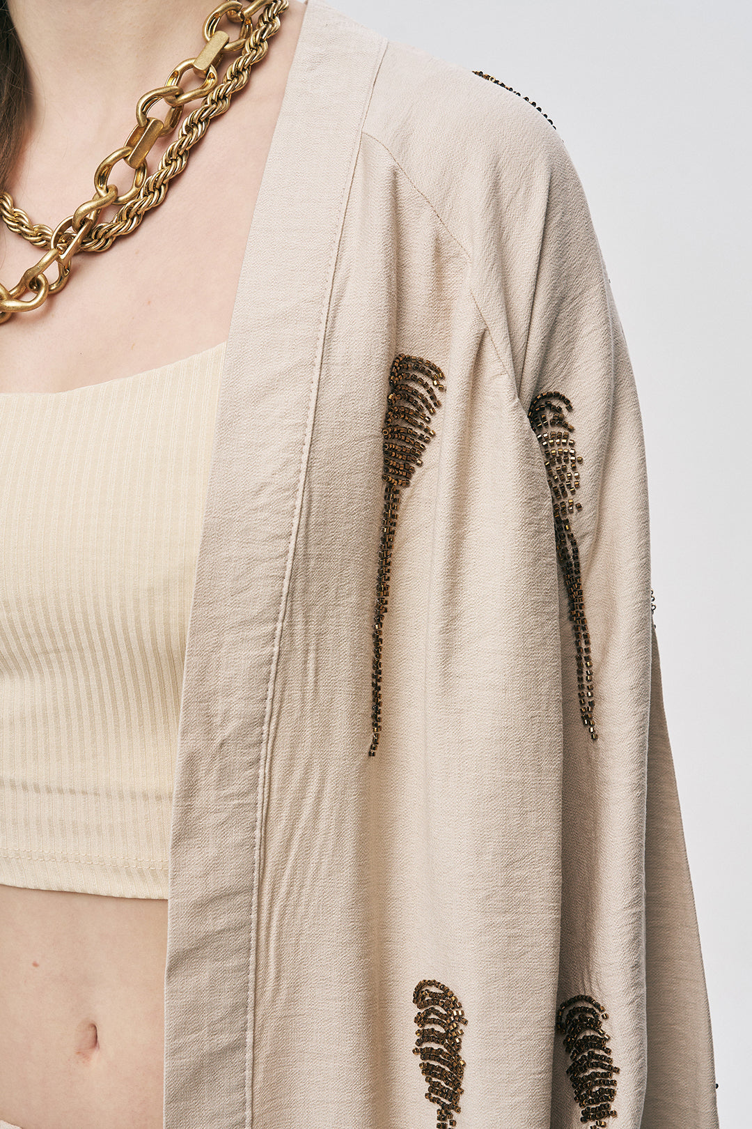 Zanaatkar Boncuk Detayları: Kimononun ön kısımlarına titizlikle yerleştirilen boncuklar, tasarıma sanatsal bir boyut ve görsel bir derinlik katar.