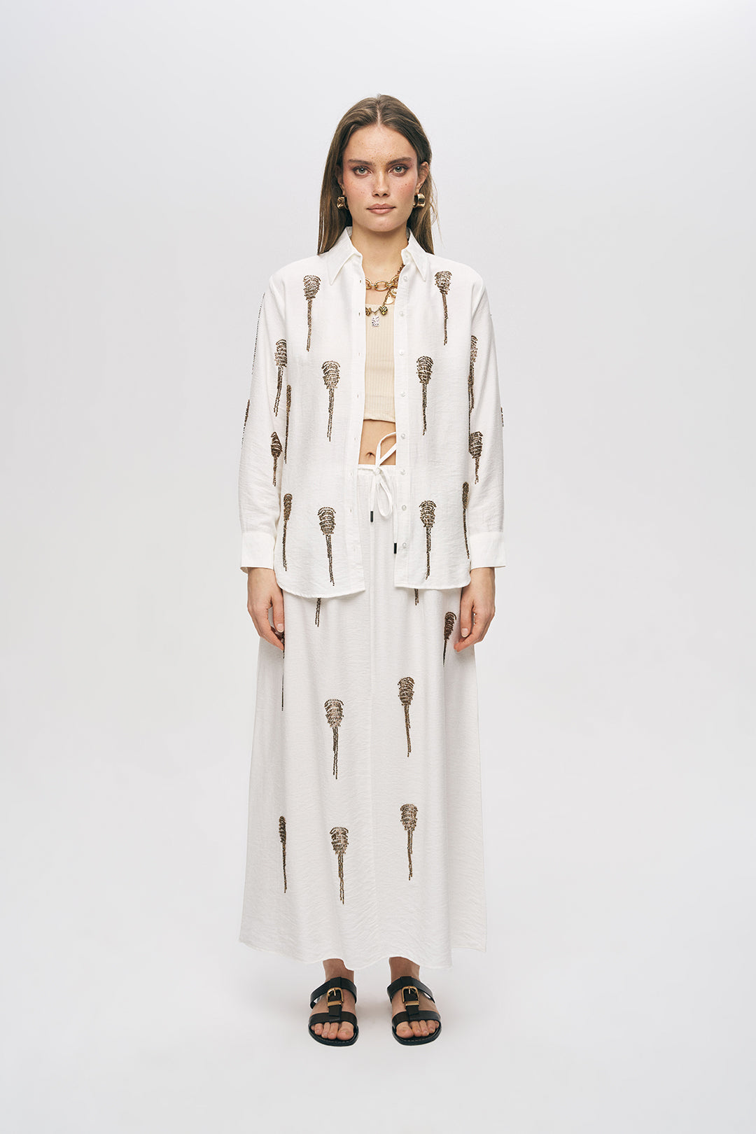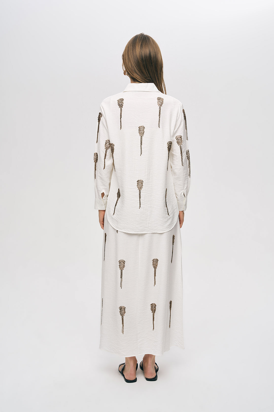 1. Monokrom Zarafet: Gömleğinizi, koleksiyonumuzdaki aynı tonlarda ve boncuk işlemeli olan Uzun Viskon Etek ile kombinleyerek 2026'nın en şık "luxury" takımını oluşturun.