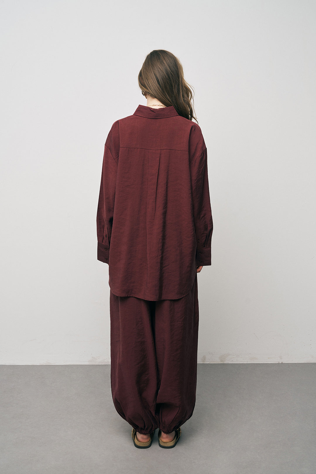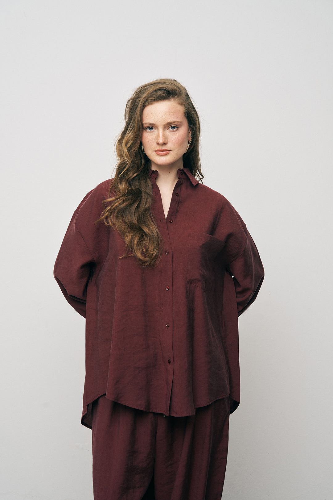 Manken Bilgisi: 1.77 cm boyundaki manken üzerinde gömleğin geniş formu ve akışkan dokusu sergilenmektedir.