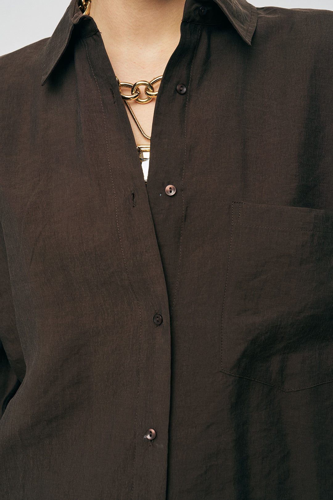 Zarif Detaylar: Sol göğüs üzerindeki fonksiyonel cep detayı ve dökümlü omuz hattı, gömleğin minimalist şıklığını tamamlar.