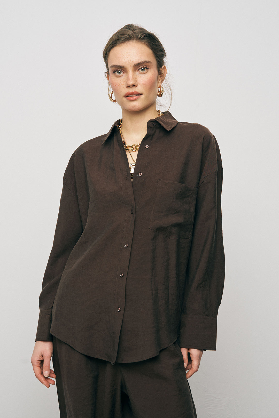Manken Bilgisi: 1.77 cm boyundaki manken üzerinde gömleğin geniş formu ve akışkan dokusu sergilenmektedir.