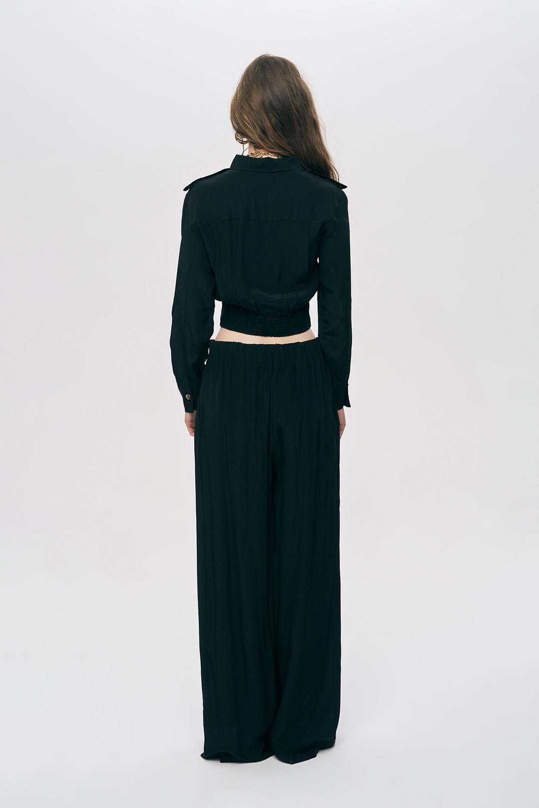 1. Kusursuz Modern Takım: Gömleğinizi, serinin devamı olan Modern Yüksek Bel Palazzo Pantolon ile aynı renkte kombinleyerek yüksek modayı yansıtan monokrom bir set oluşturun.