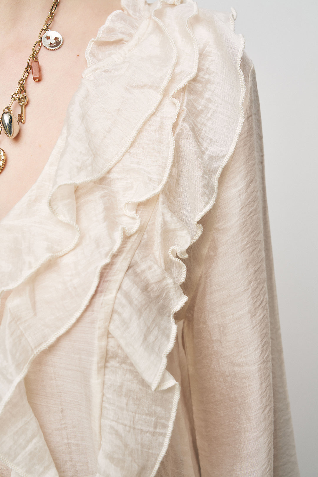 Karakteristik Volan Detayları: Göğüs ve yaka kısmında yoğunlaşan volanlar, tasarıma üç boyutlu bir hareketlilik ve feminen bir hava katar.