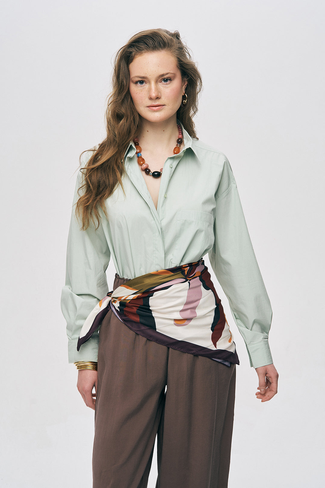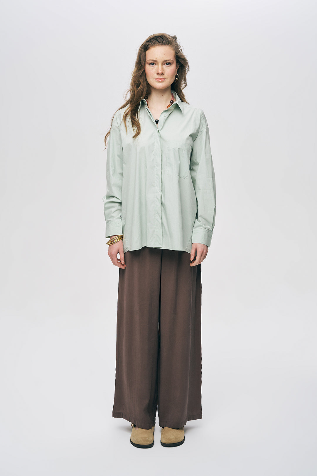 1. Monokrom Şıklık: Gömleğinizi, koleksiyondaki aynı renk tonuna sahip Yanı Boncuk İşlemeli Modal Pantolon ile birleştirerek bütünsel ve lüks bir görünüm oluşturun.