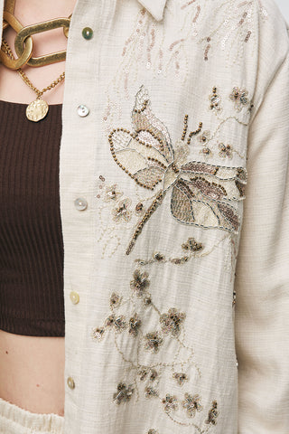 Kadın Kelebek Nakış İşlemeli Natur Oversize Gömlek